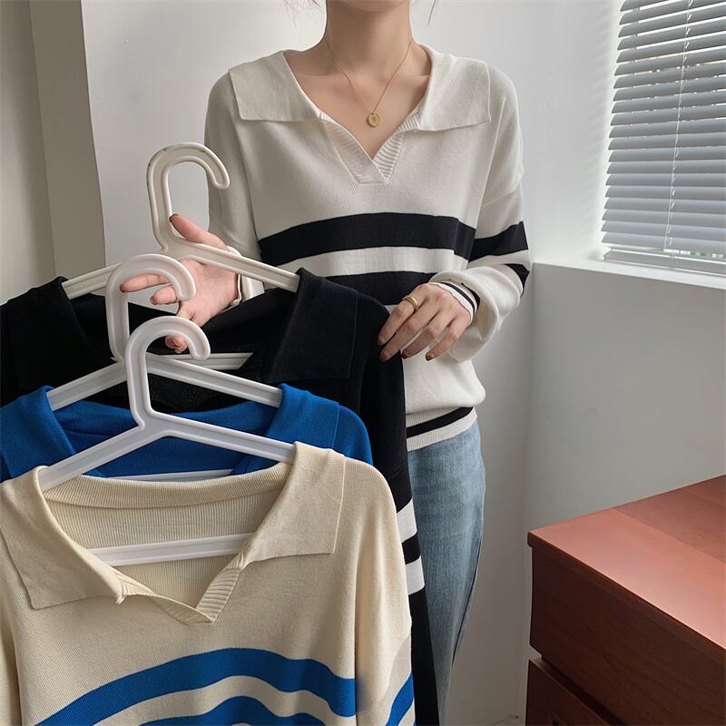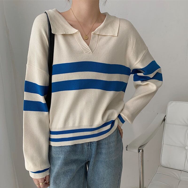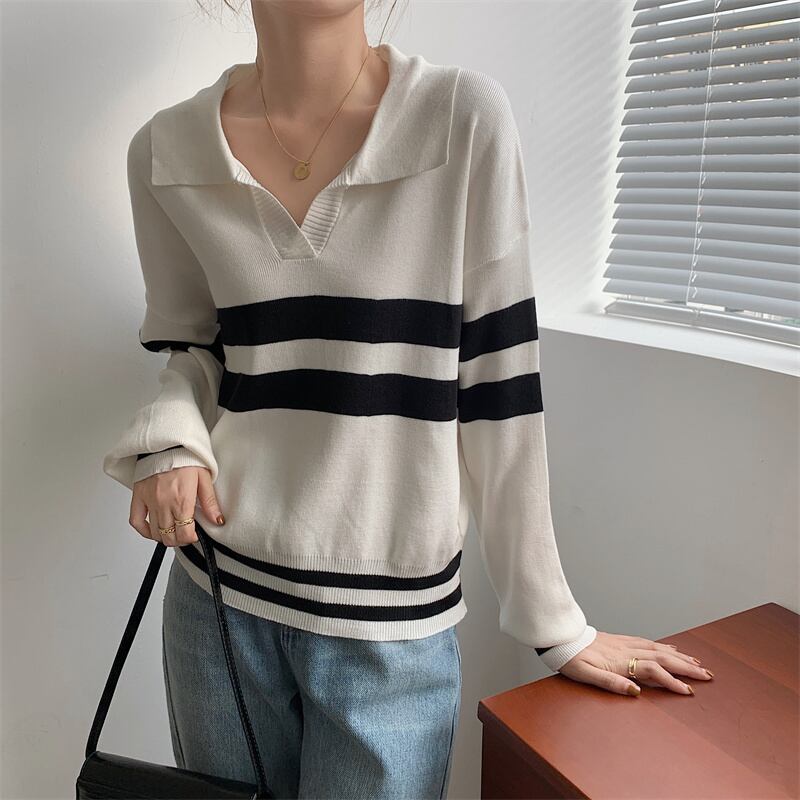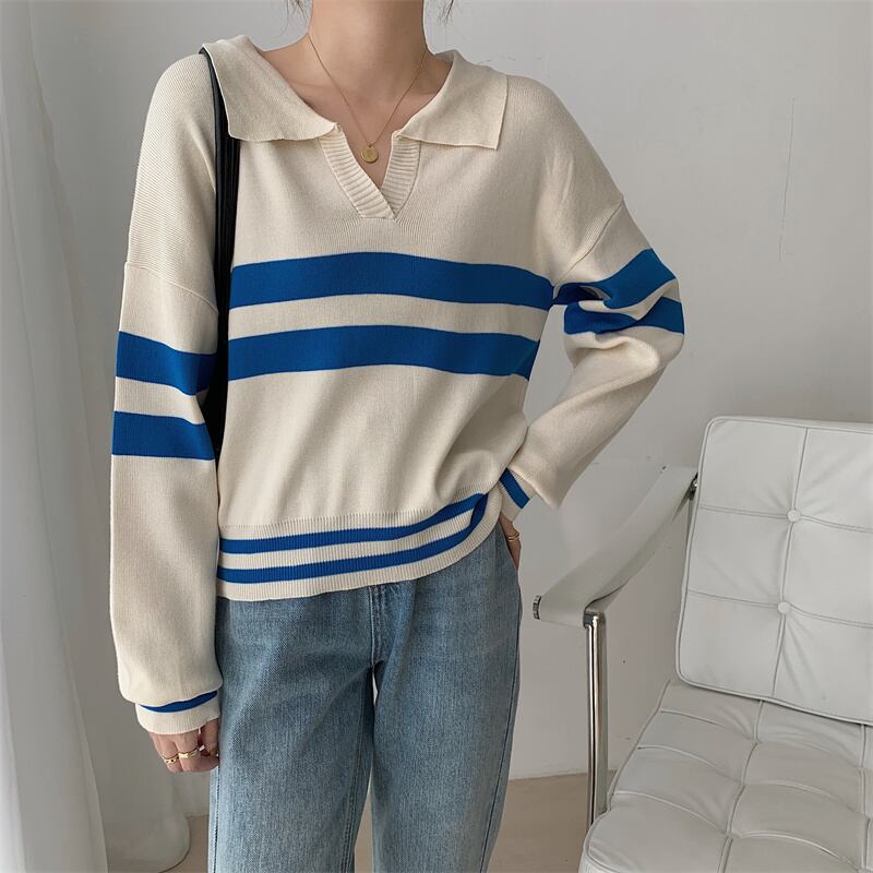 春秋の女性のカジュアルスリム V ネック長袖ストライプ配色セーター怠惰なソフトニットジャンパープルオーバー ロング スプリング 春物 オータム 秋物 Vネック Aim43683849132