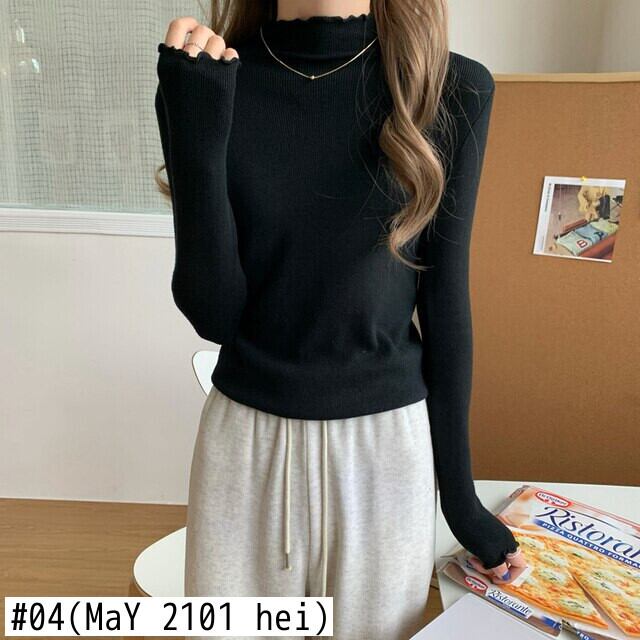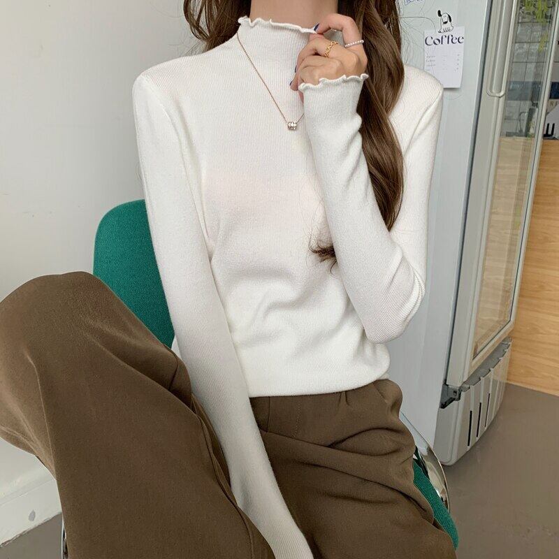新しい女性のセーターフリルハーフタートルネック弾性スリム長袖ニットセータージャンパーソフト底入れプルオーバー y2k 服 ロング ラッフル エラスティック 伸縮 Aim28330781436