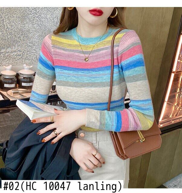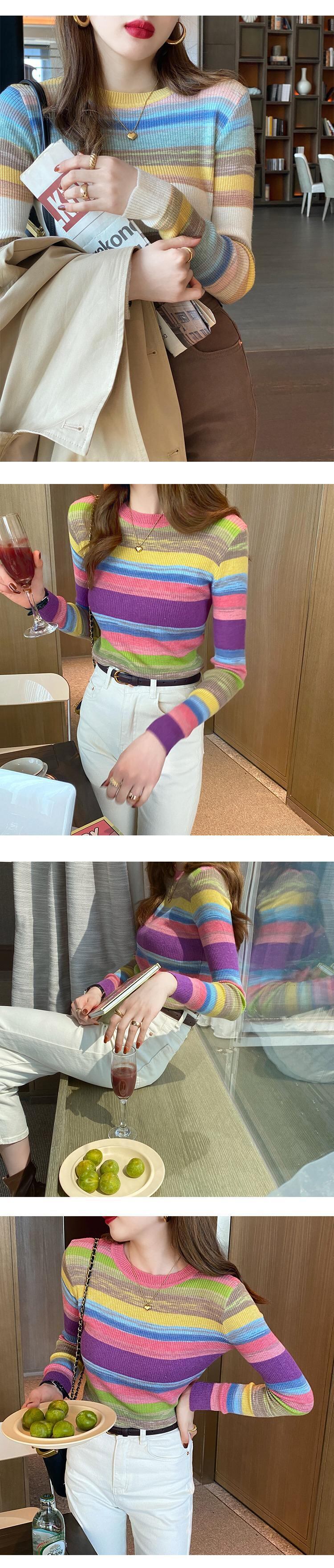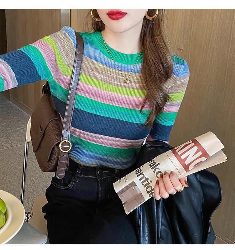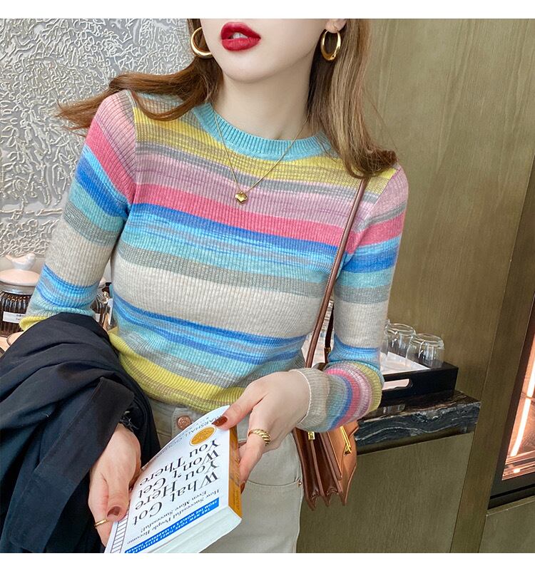 秋長袖セーター女性プルオーバーレインボーストライプスリム薄型ニットセーターファッション O ネック弾性底入れ y2k トップス ロング エラスティック 伸縮 オータム 秋物 Oネック Aim74182313942