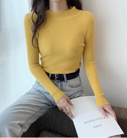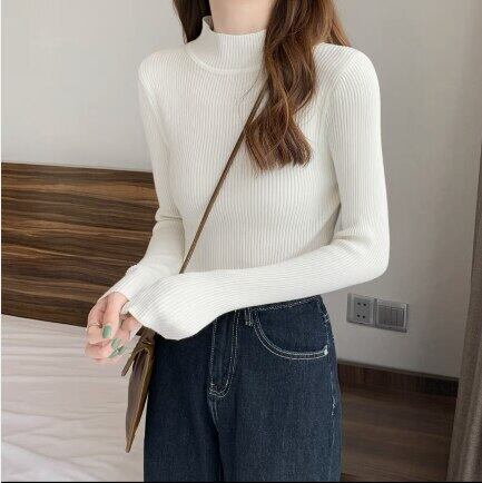 秋固体スリム薄いニットセーター長袖女性のセータープルオーバーファッションハーフタートルネック弾性底入れトップス ロング エラスティック 伸縮 オータム 秋物 ソリッドカラー Aim98633775041