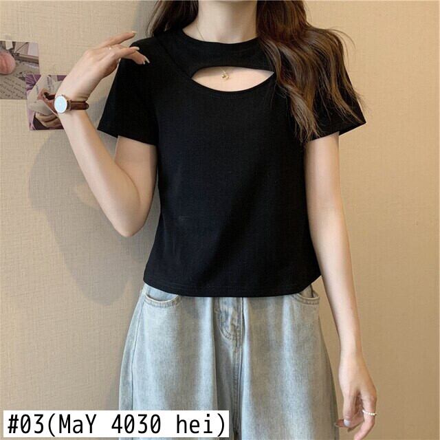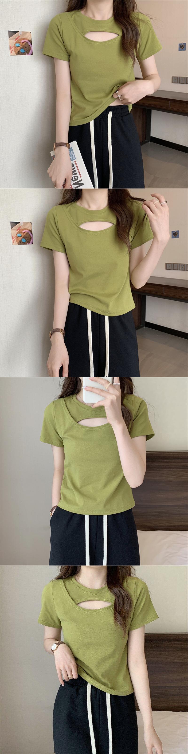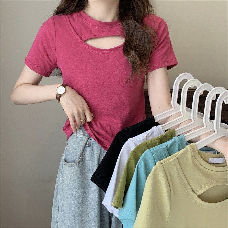 夏の服の女性ソリッド tシャツ原宿半袖黒、白 Tシャツ中空アウトスリムベーシック Tシャツクロップトップ ショート ホワイト ブラック ハーフスリーブ かわいい サマー 夏物 ソリッドカラー Aim31933048809