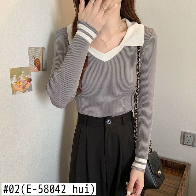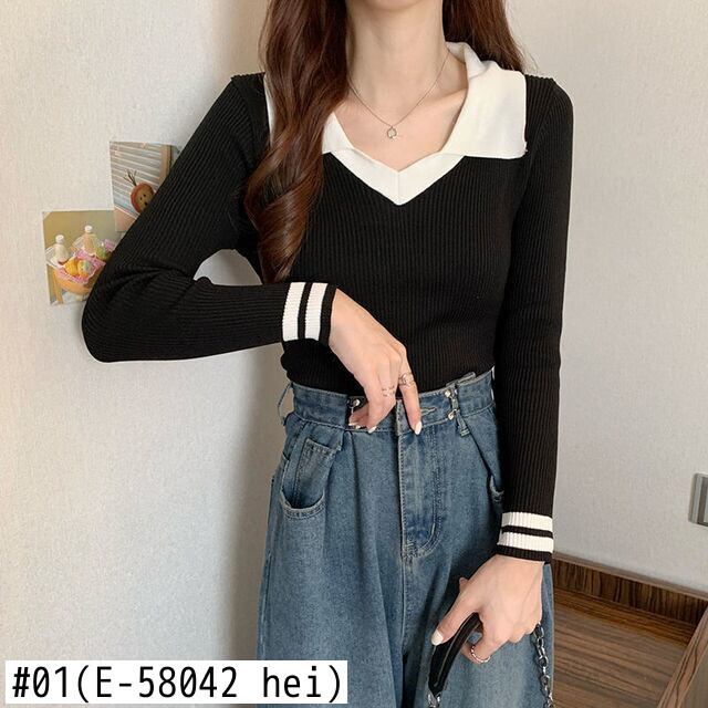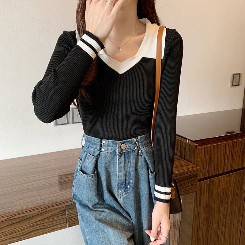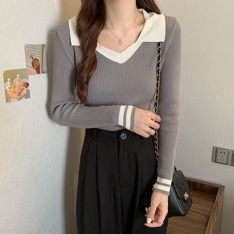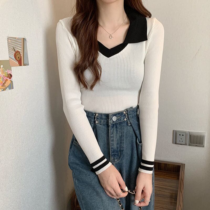 カラーマッチングニットセーター女性プルオーバー原宿スリムベーシッククロップドトップス韓国ジャンパー Y2K セーター かわいい Aim71625002136