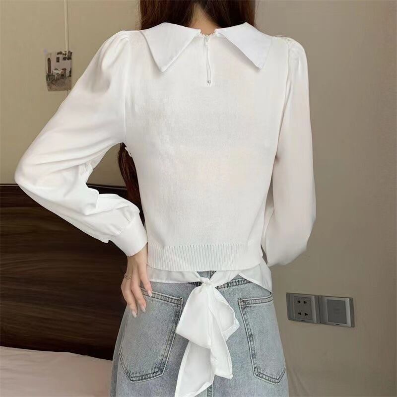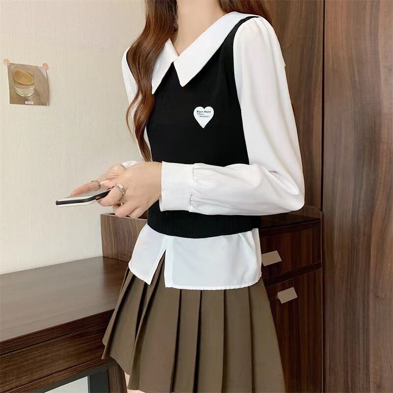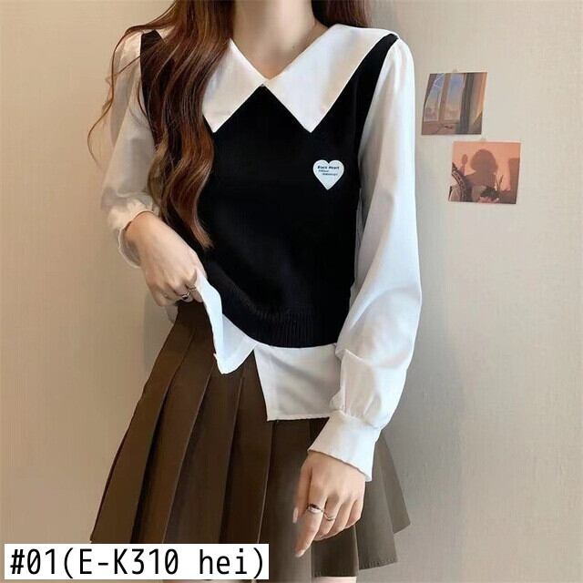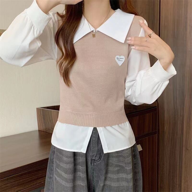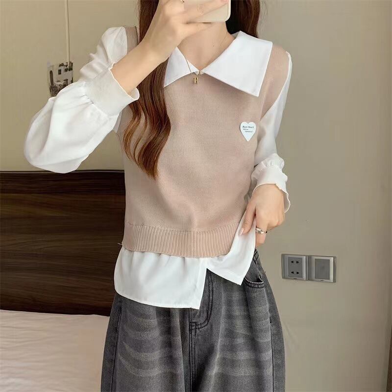 韓国女性長袖ターンダウンネックニットセータープレッピースタイルフェイク二枚スリムカジュアルトップスソフトセータートップス ロング Aim40138300169