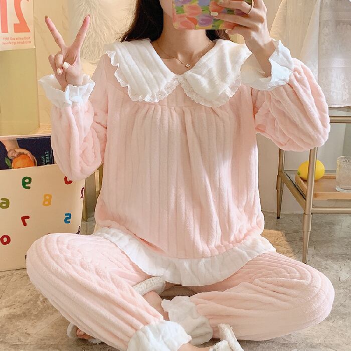 冬の女性の長袖ナイトウェア女性のパジャマセットレジャー弾性ウエスト暖かいフランネルパジャマセットガールホームウェア服 ロング エラスティック 伸縮 ウィンター 冬物 Aim15099512343