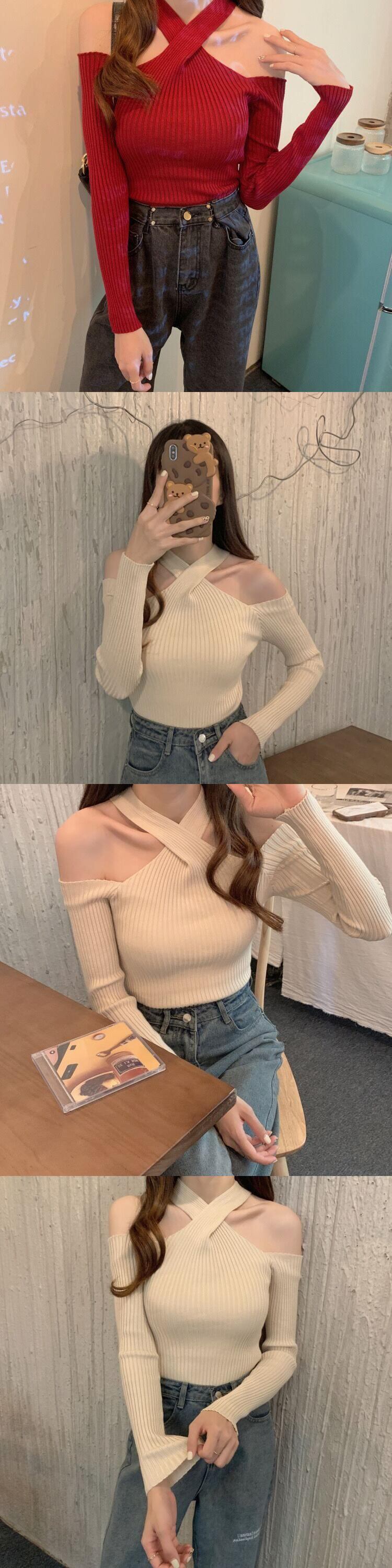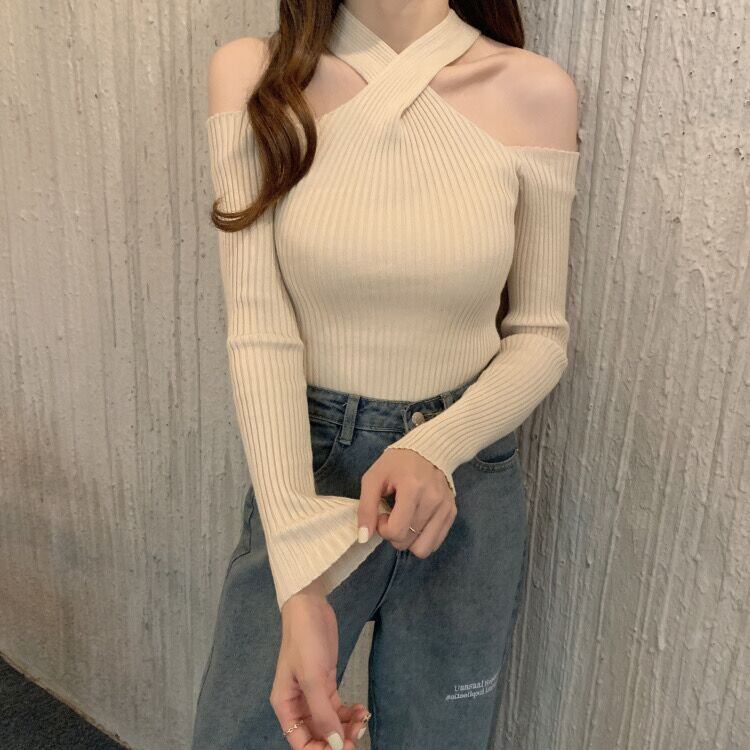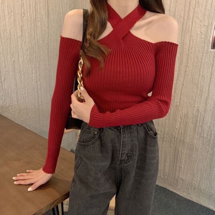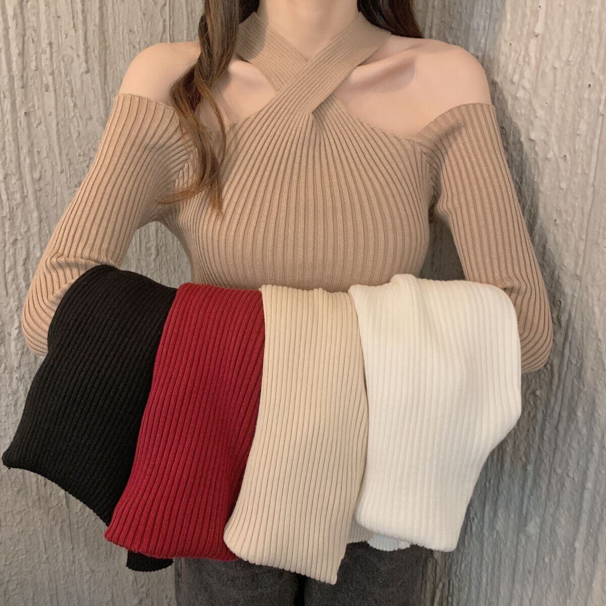 秋の女性プルオーバーセクシーなホルター長袖ニット薄型セーター女性ファッション固体弾性スリムトップスセーター y2k 服 ロング エラスティック 伸縮 オータム 秋物 ソリッドカラー Aim45215141367