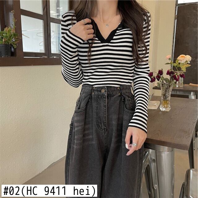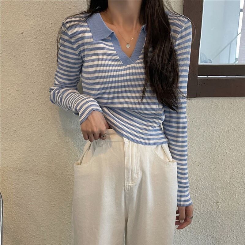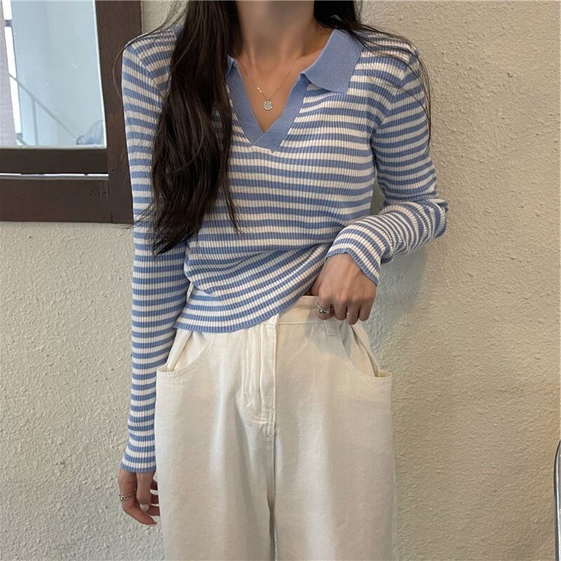 秋ニットセータープルオーバースリムオールマッチ長袖ストライプセーター Tシャツジャンパートップス Y2K 女性服 ロング オータム 秋物 Aim2424198095