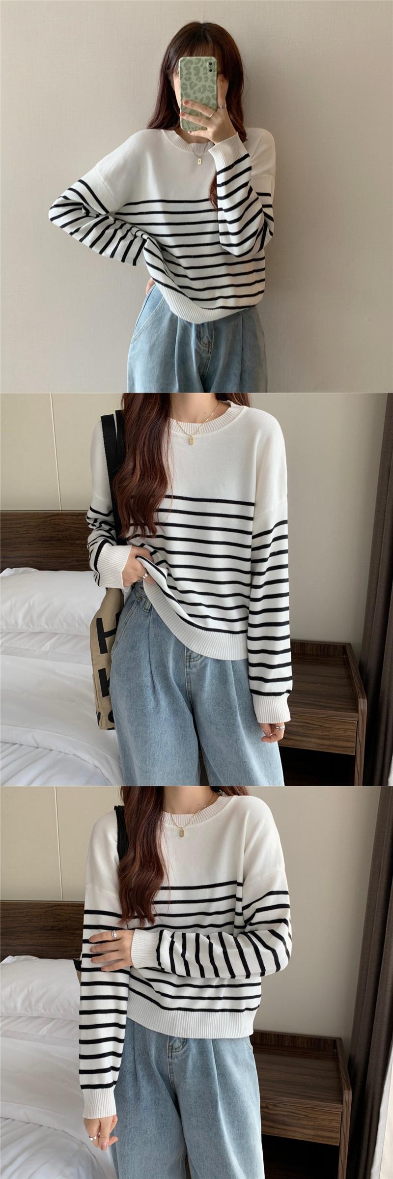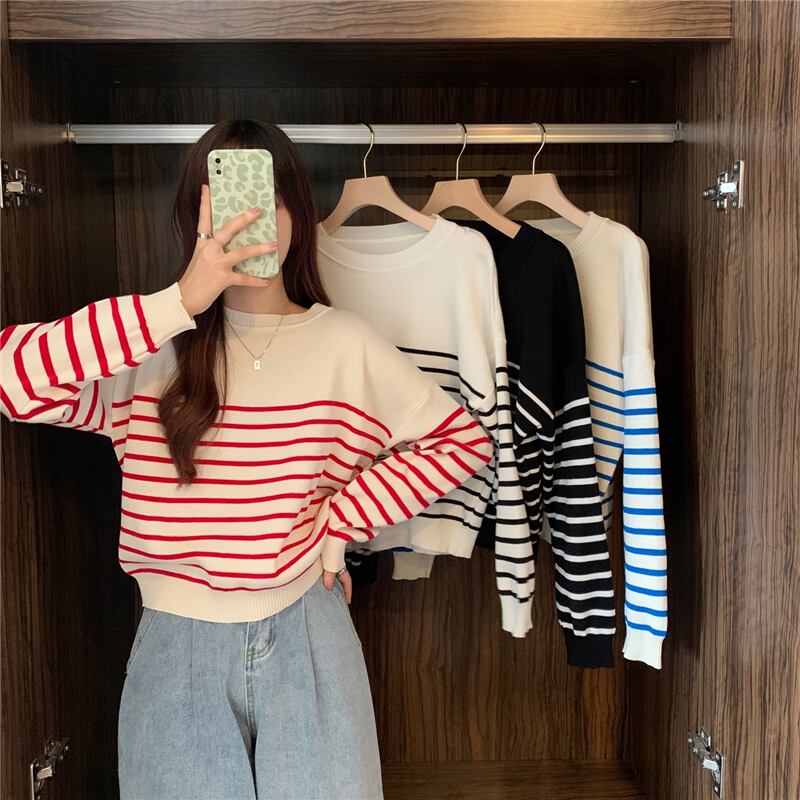 2023 韓国底入れシャツ女性の赤トップストライプパッチワークカジュアルルーズ O ネックニットセーター女性プルオーバーオールマッチセーター レッド Oネック Aim34257778247
