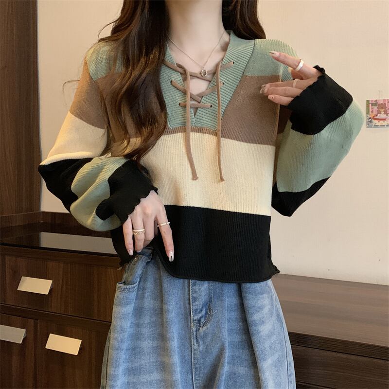 カラーマッチングニットセーター女性春プルオーバー原宿レースアップクロップドトップス韓国ジャンパーセーター かわいい スプリング 春物 Aim91279875732
