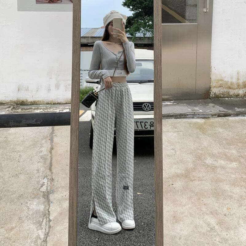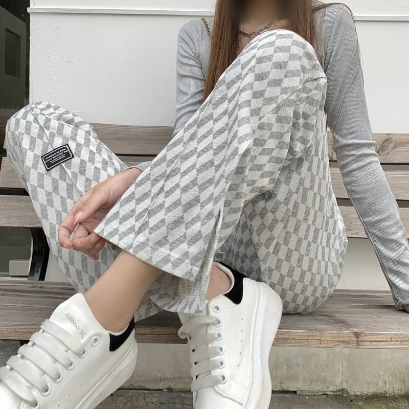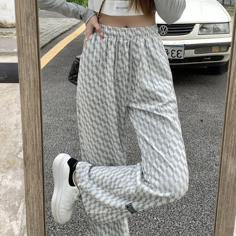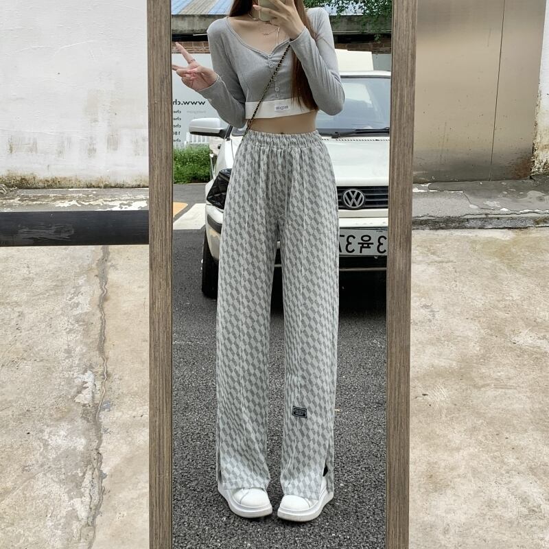 スウェットパンツ女性ワイドレッグパンツ韓国のレトロなウエストチェック柄弾性女性パンツ原宿グレー緩い長ズボン ロング エラスティック 伸縮 かわいい ワイドパンツ Aim81009829333