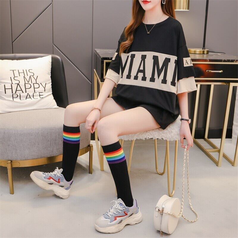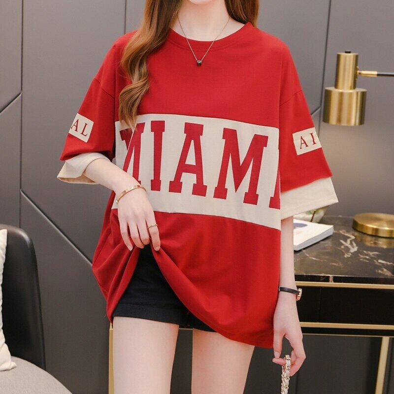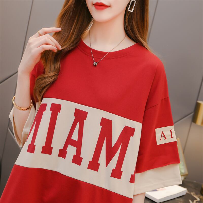 レタープリント Tシャツ女性 O ネックカラーマッチング特大 tシャツファッションコットントップスレジャーハーフスリーブ女性 tシャツ 半袖 Oネック Aim36685175053