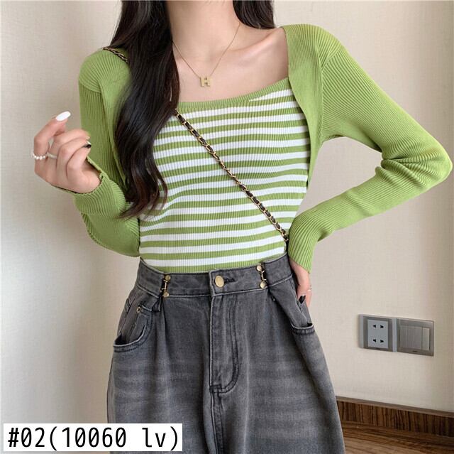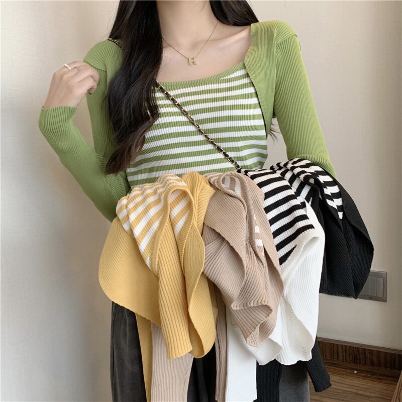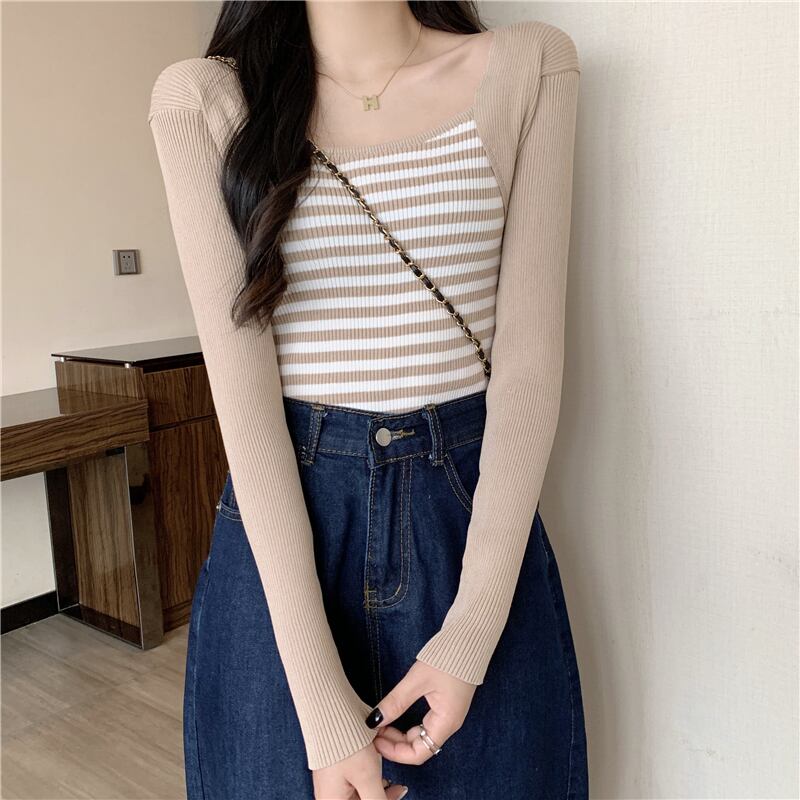 春スリムニットセーター女性プルオーバー長袖ストライプスプライスセーター Tシャツジャンパークロップトップス服 ロング スプリング 春物 Aim88766643425