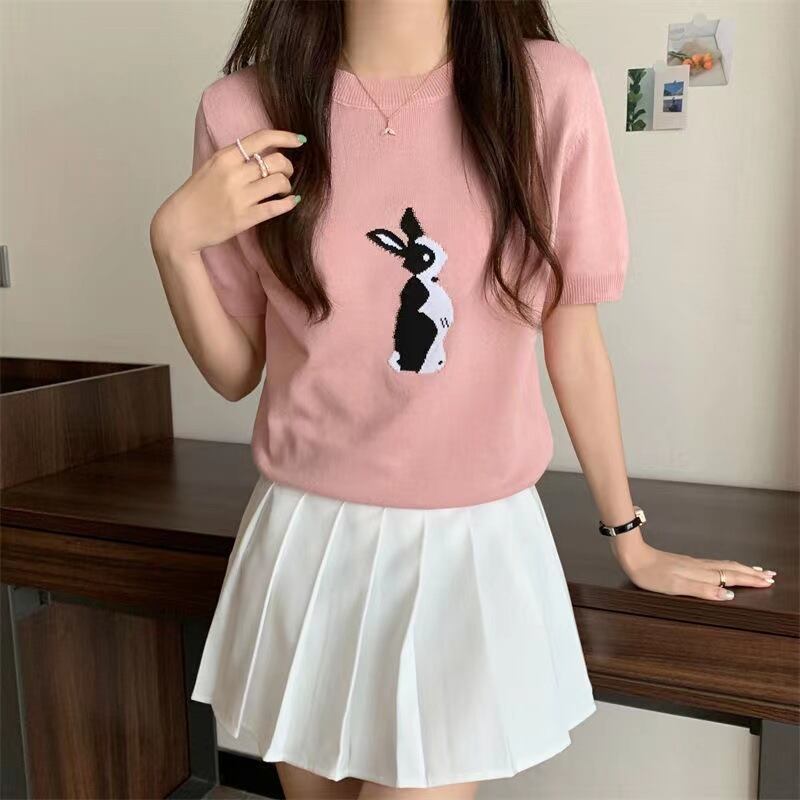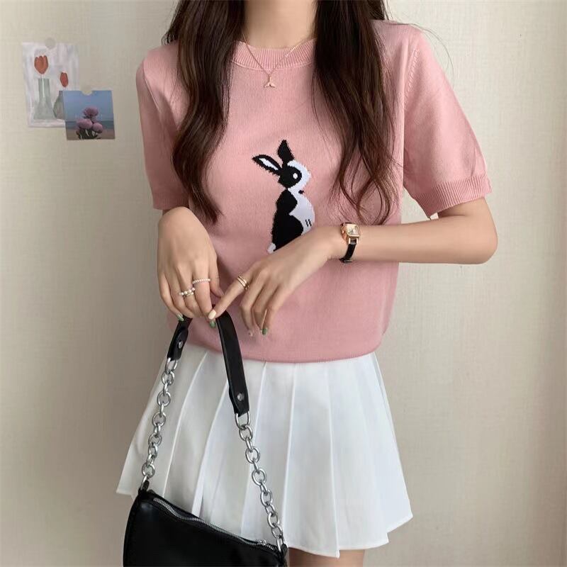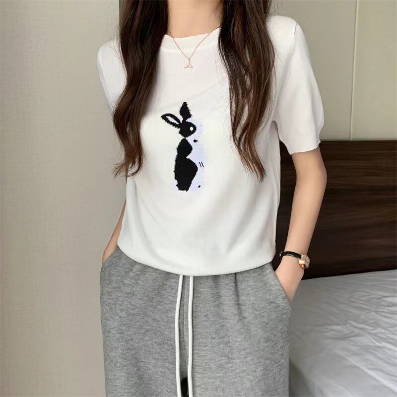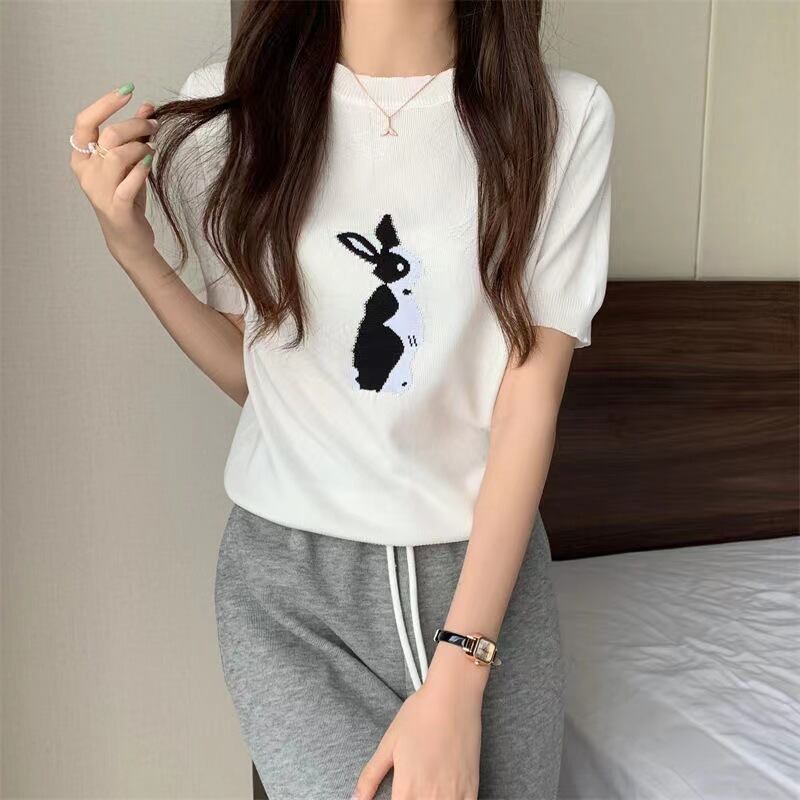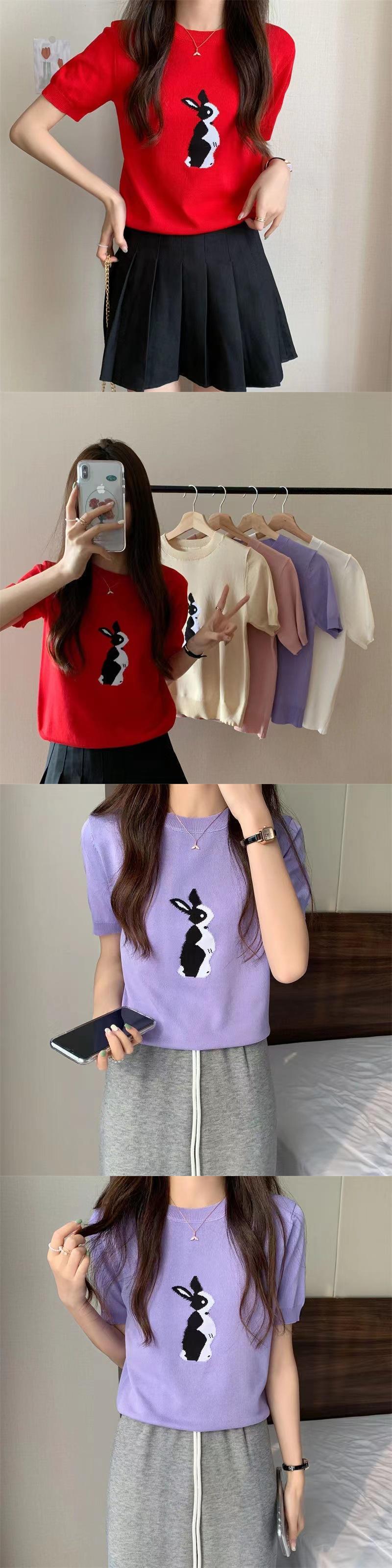 スタイル O ネック素敵な女性セーター半袖トップススリム漫画刺繍プルオーバー若いニットセーター ショート ハーフスリーブ Oネック かわいい Aim12006405395
