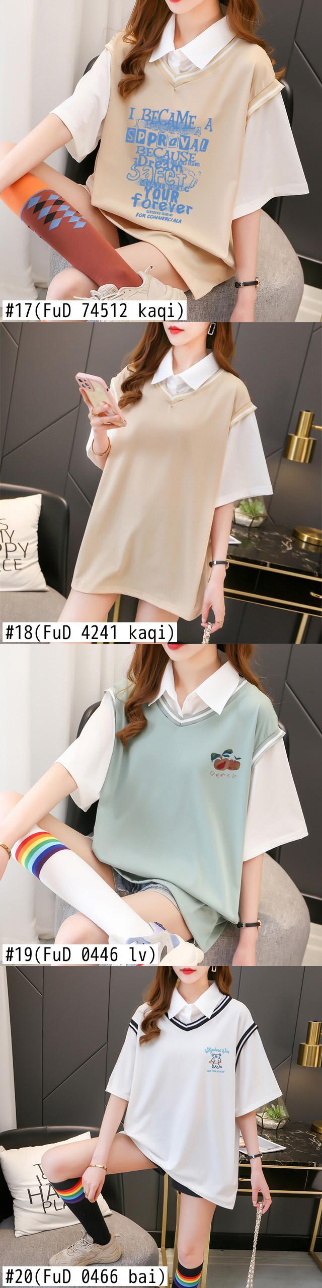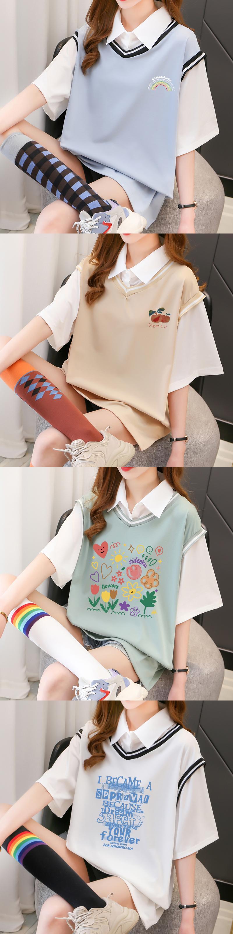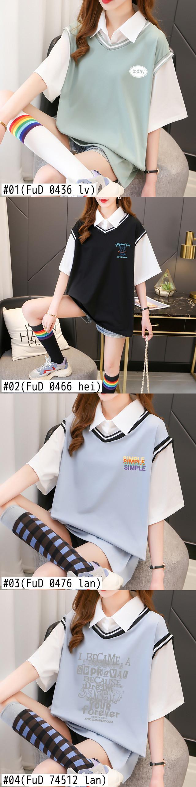 プレッピースタイルカジュアル特大 Tシャツ女性綿カラーマッチング Tシャツ半袖フェイク二枚トップス学生 Tシャツ ショート コットン ハーフスリーブ Aim93094084366