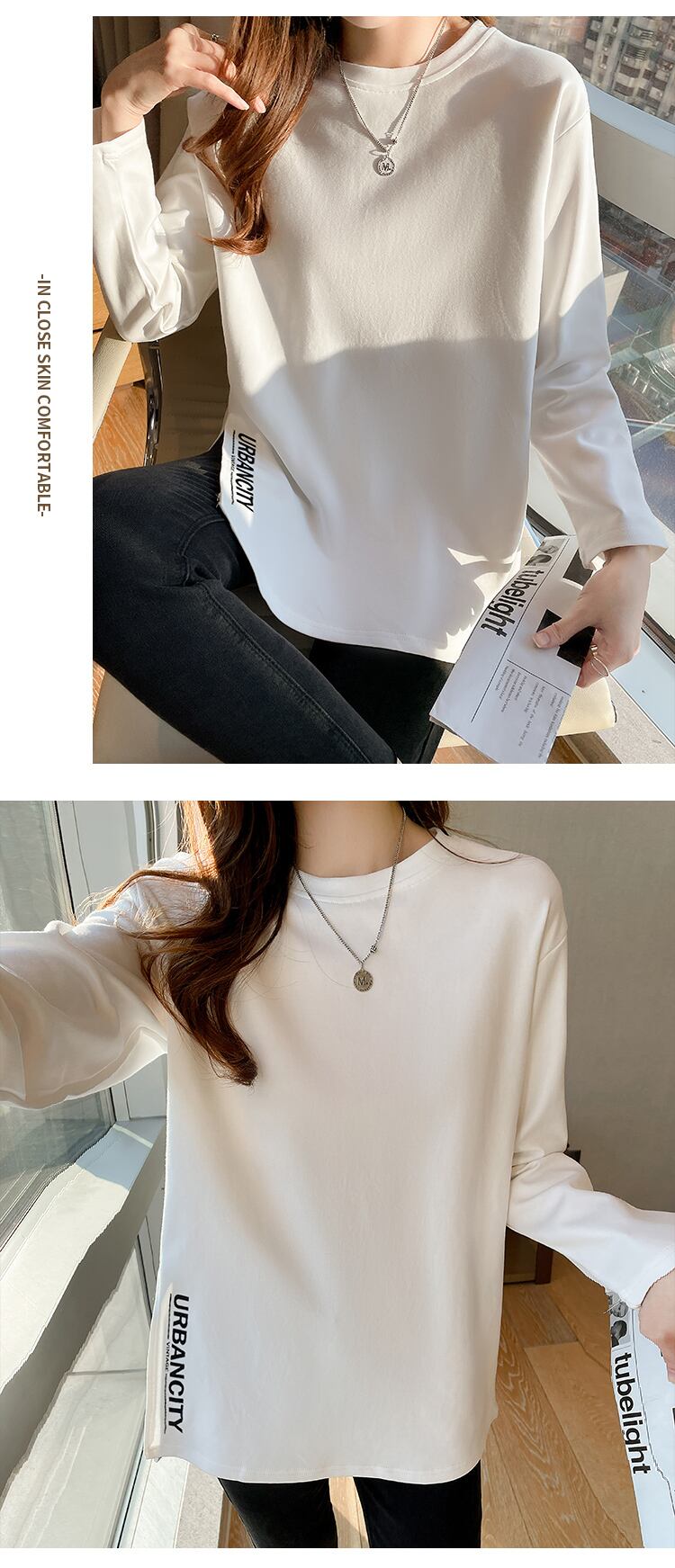 原宿純綿サイドスプリットベーシックホワイト Tシャツ長袖レター刺繍 Tシャツ女性 Y2k トップスストリート ロング コットン かわいい ピュア Aim62233009566