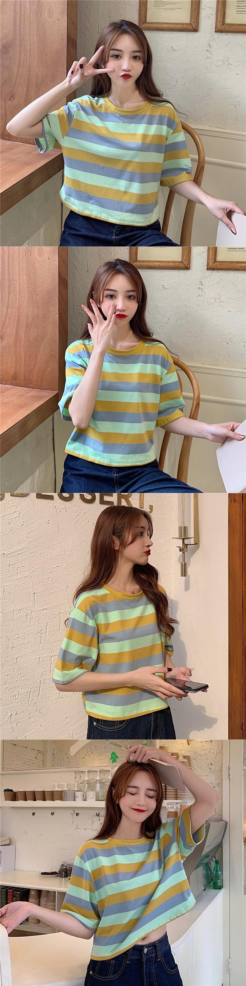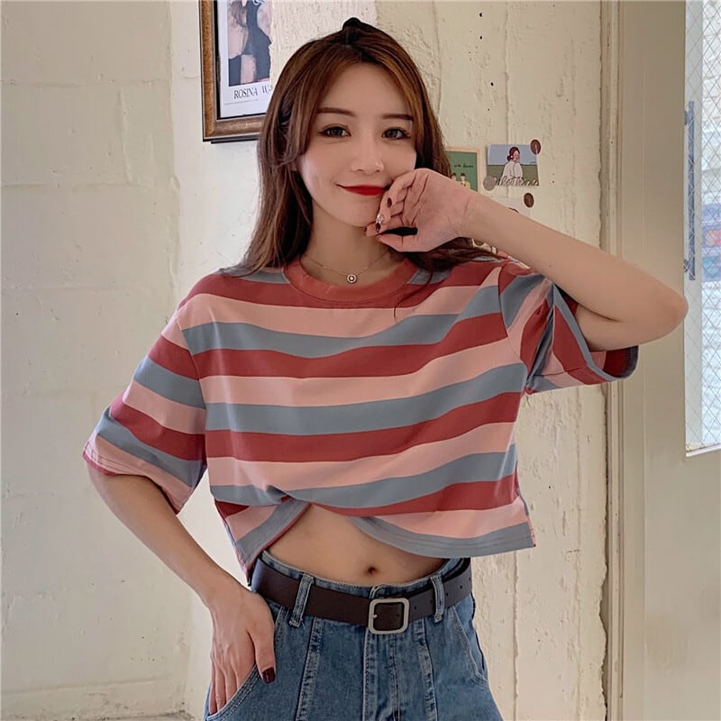 夏クロップトップス Tシャツ女性グラフィック Tシャツ原宿ストライプ Tシャツ女性 O ネック若いゴス Y2k 服 かわいい サマー 夏物 Oネック Aim16537121968