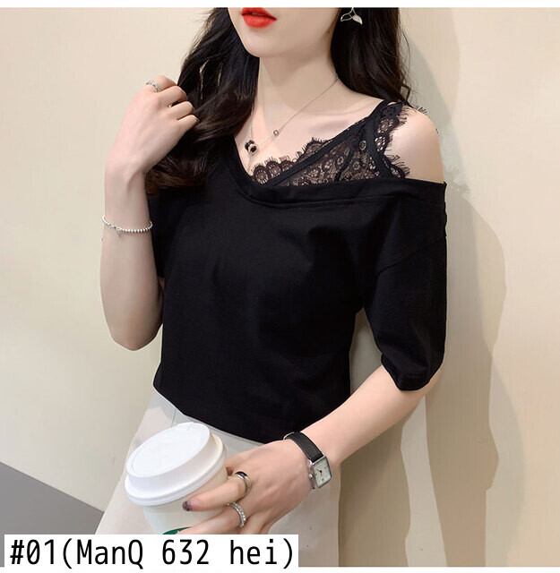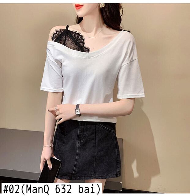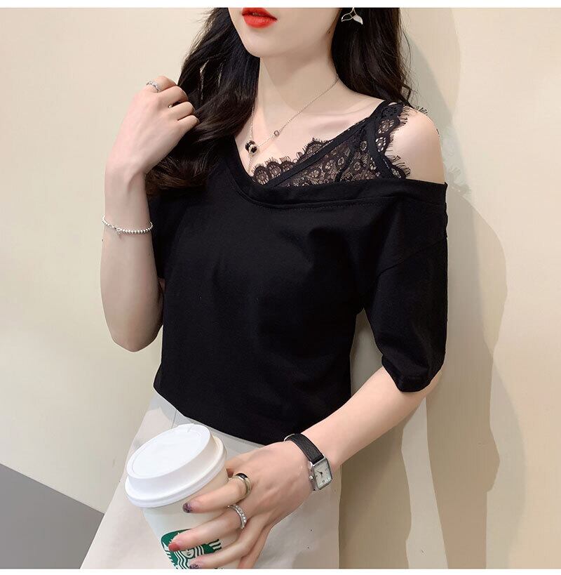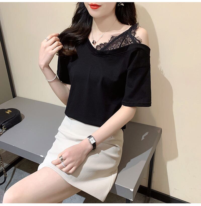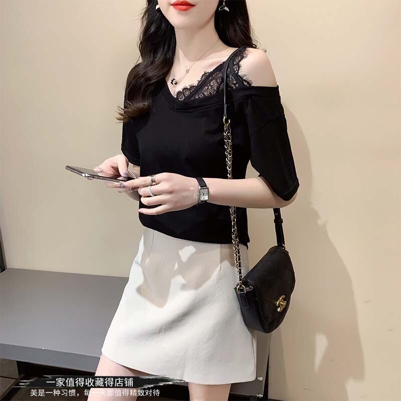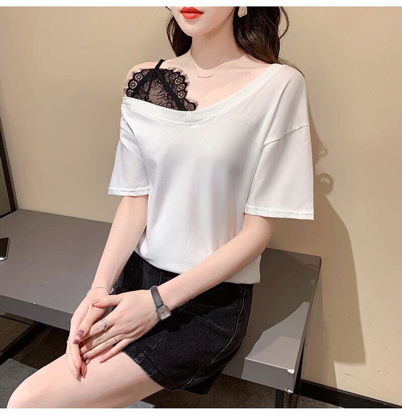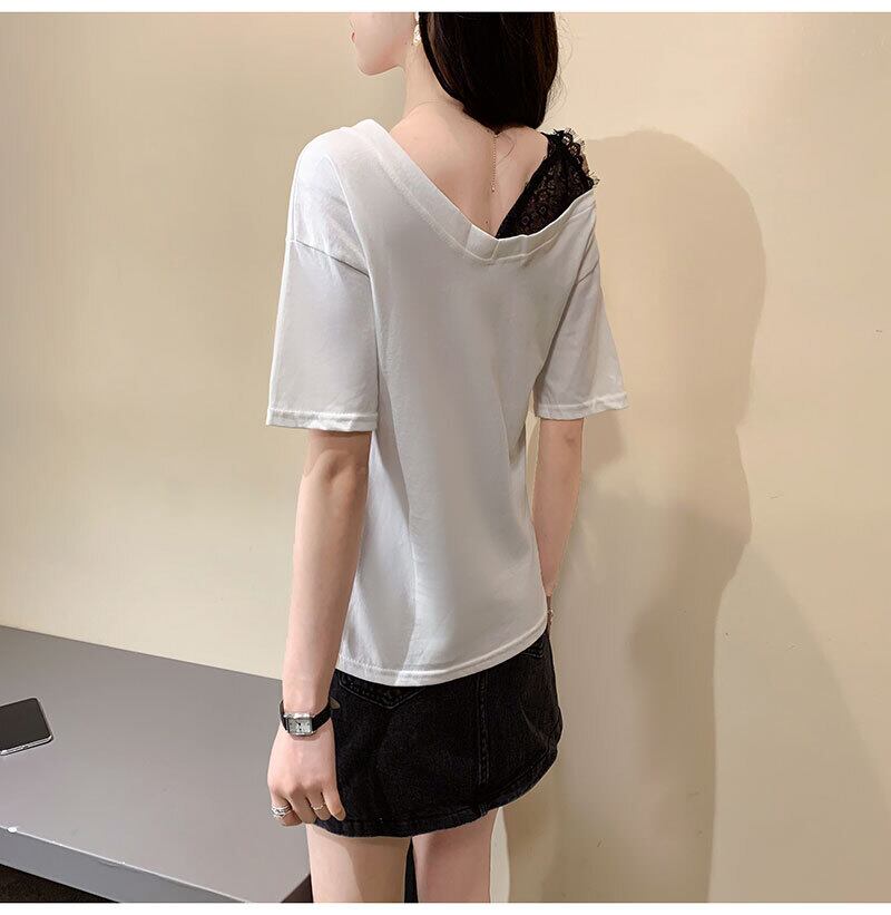 韓国純綿固体 Tシャツ半袖セクシーなレースステッチ緩いカジュアルな夏の女性服白トップスグラフィック Tシャツ ショート ホワイト コットン ハーフスリーブ サマー 夏物 ピュア ソリッドカラー Aim6851956896
