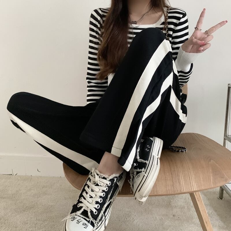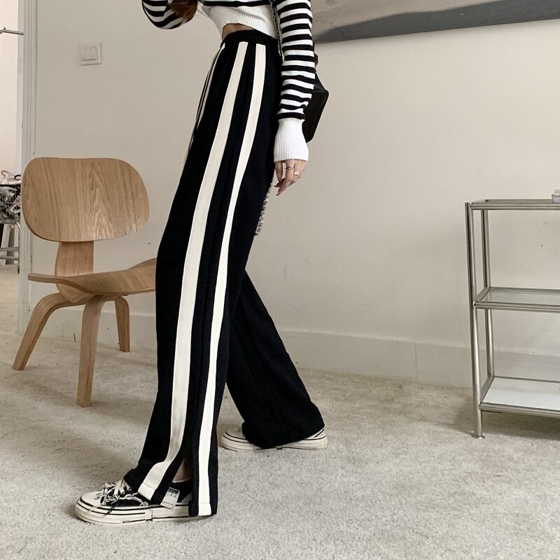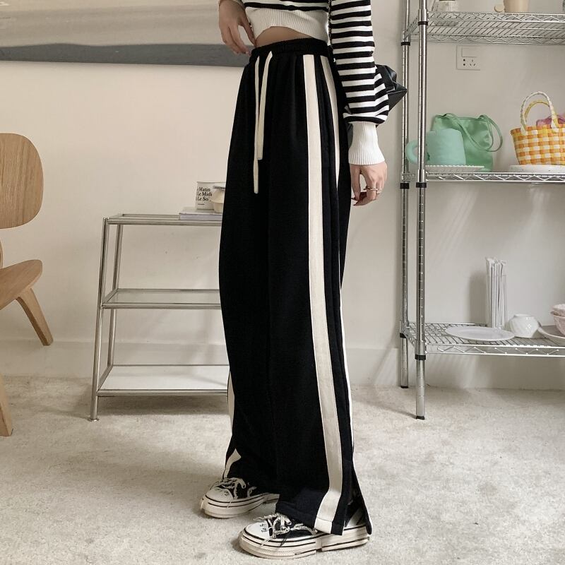 原宿女 ブラック カジュアル エラスティック 伸縮 かわいい ストライプ ワイドレッグ ワイドパンツ Aim68736186040