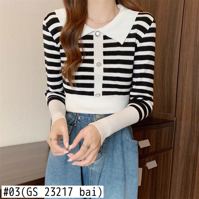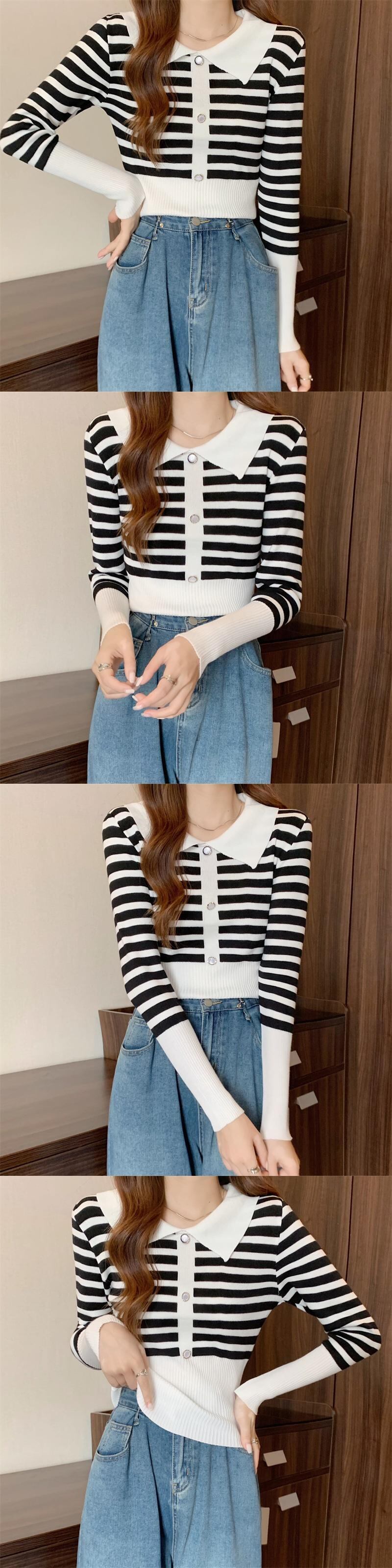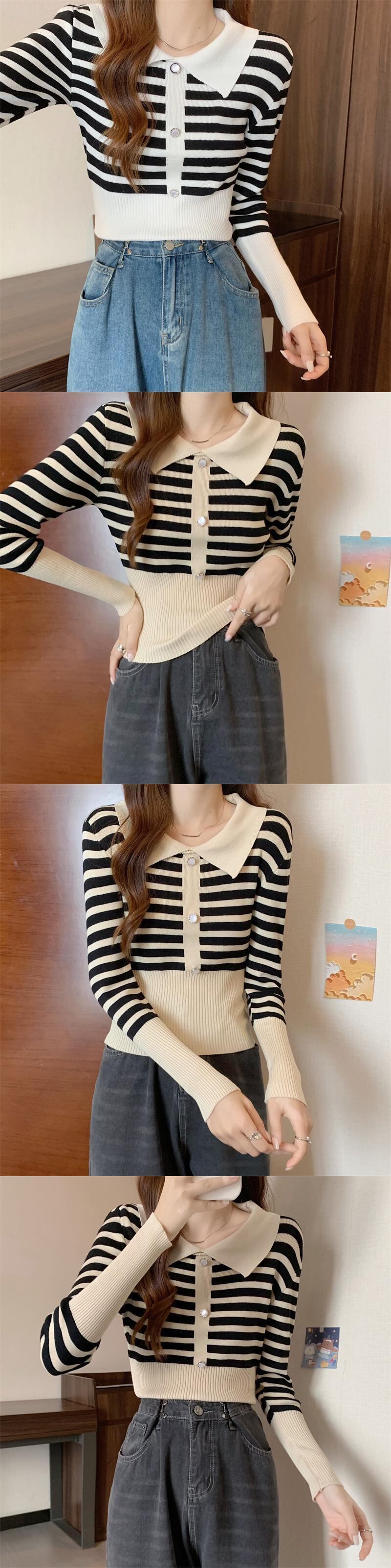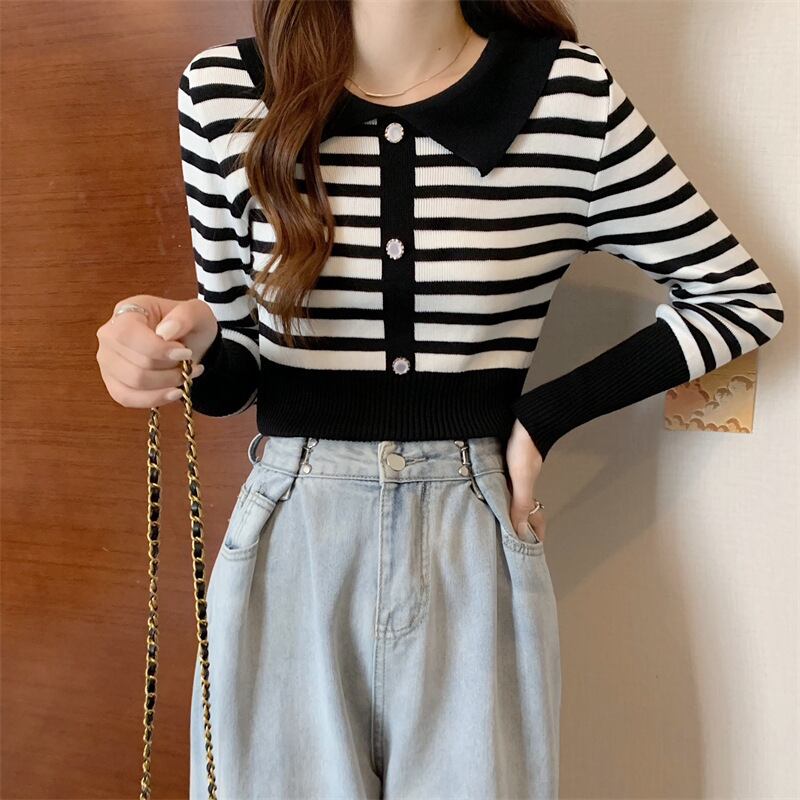 春 スリム ニット セーター プルオーバー オールマッチ ボタン 長袖 ストライプ セーター Tシャツ ジャンパー クロップ トップ свитер женский ロング スプリング 春物 Aim97537105399
