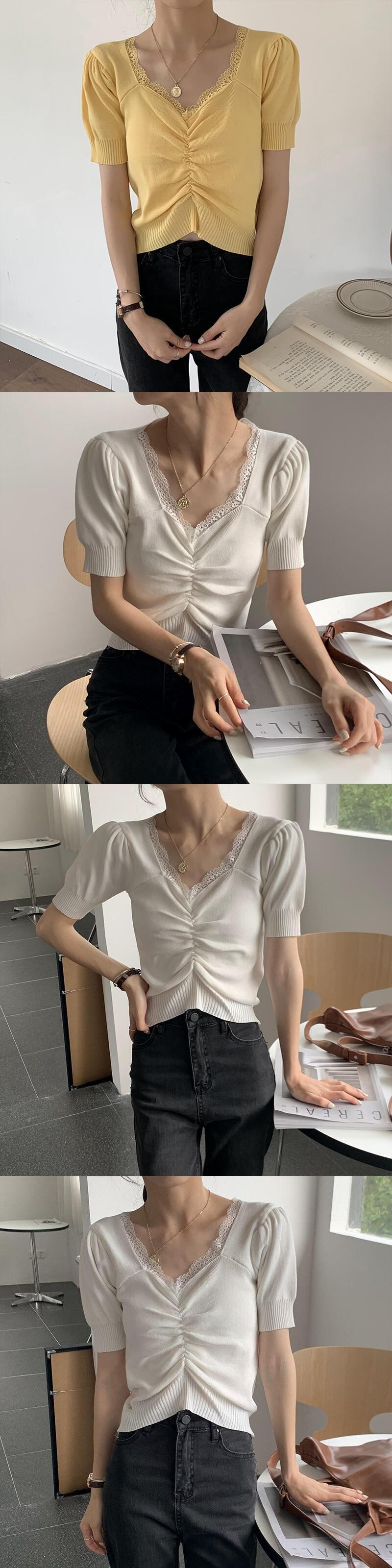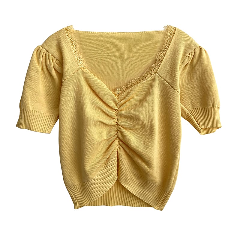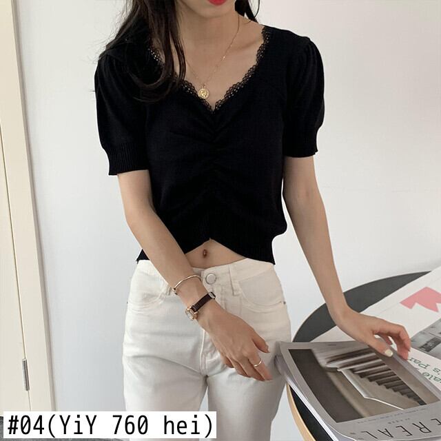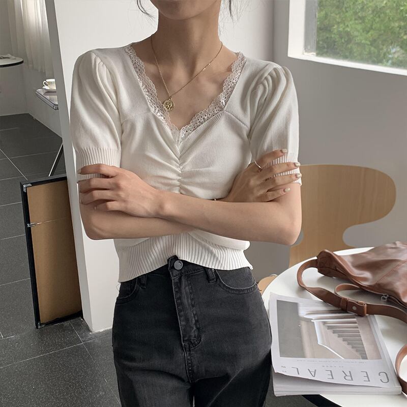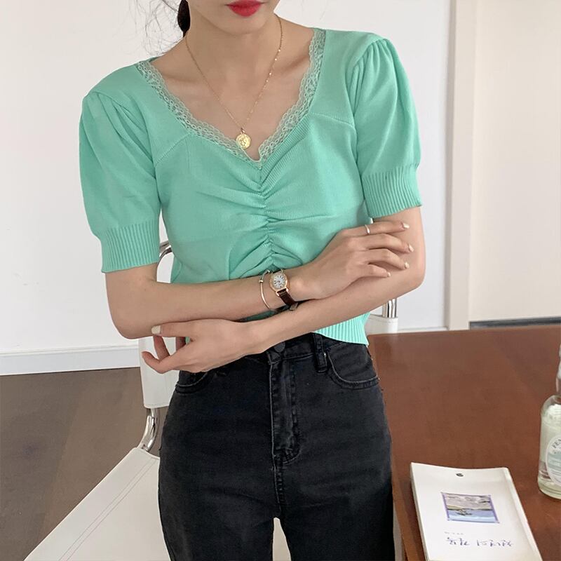 V ネック レース ステッチ女性セーター ファッション固体パフ スリーブ クロップ トップス プルオーバー ニット セーター女性服 Vネック ソリッドカラー Aim73897593734