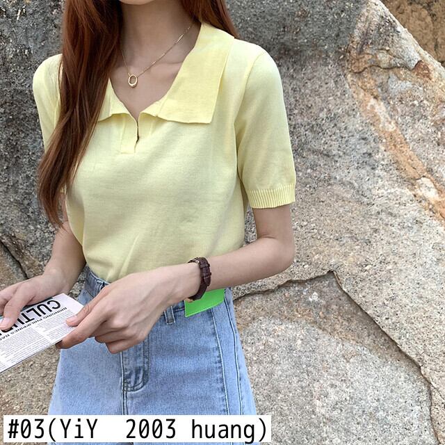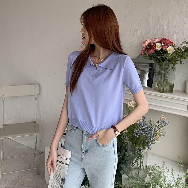 ターンダウン襟の女性のセーターファッション固体半袖クロップトップスプルオーバーニットセーター女性 y2k 服 ショート ハーフスリーブ ソリッドカラー Aim99974371855