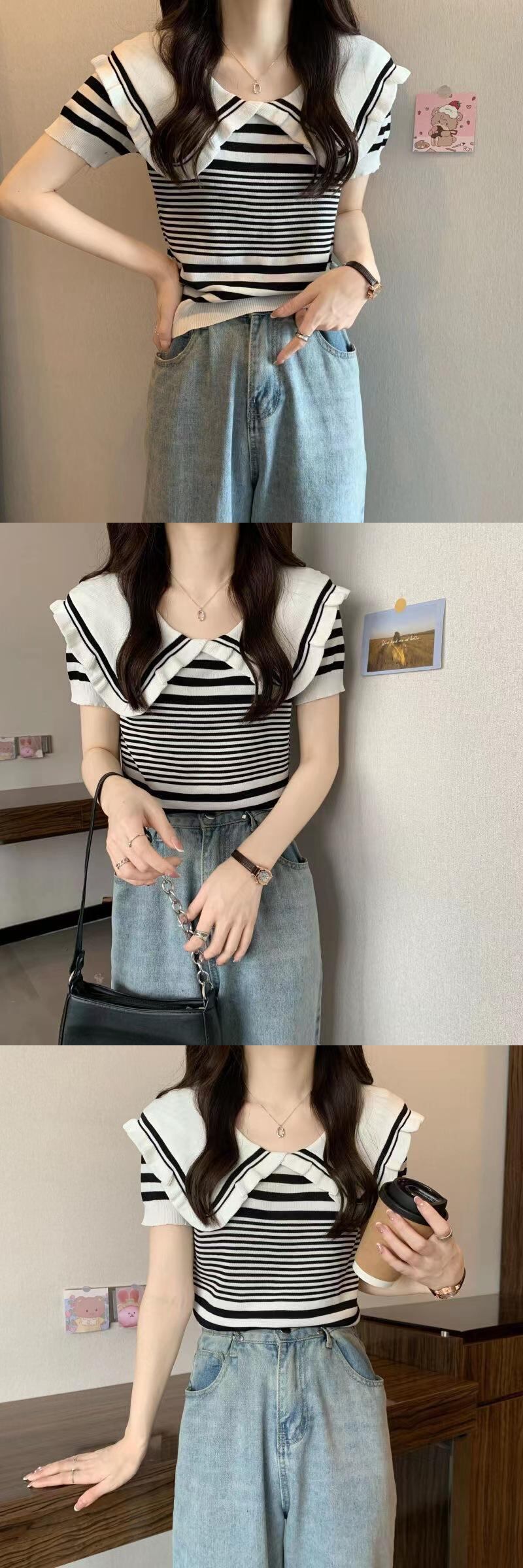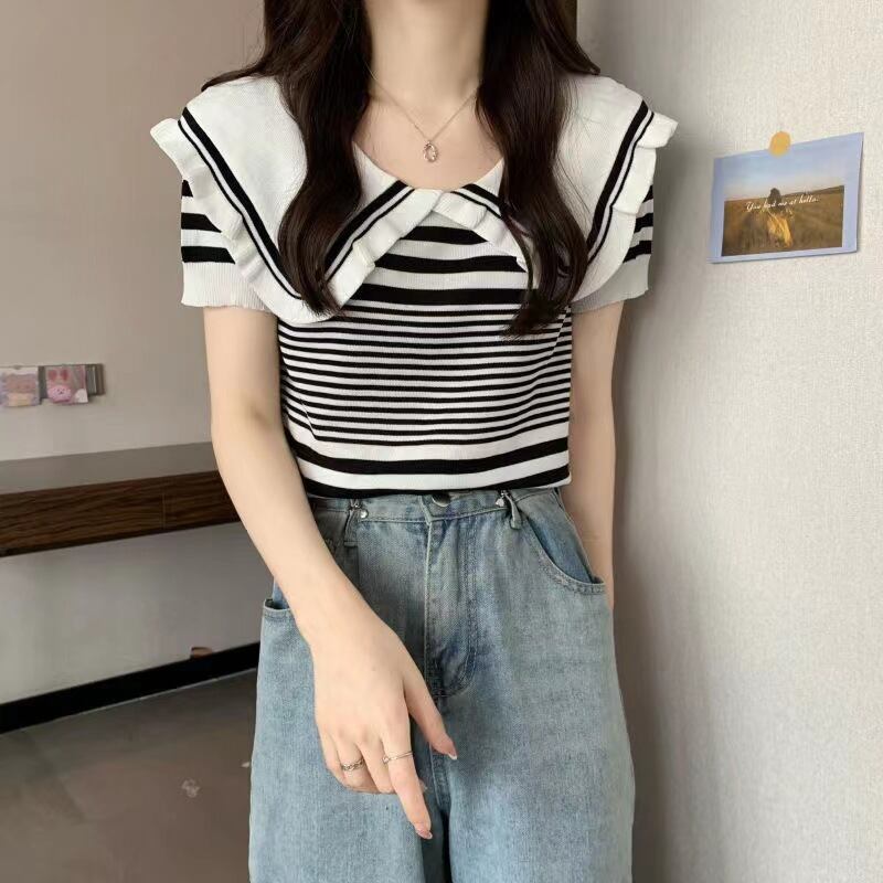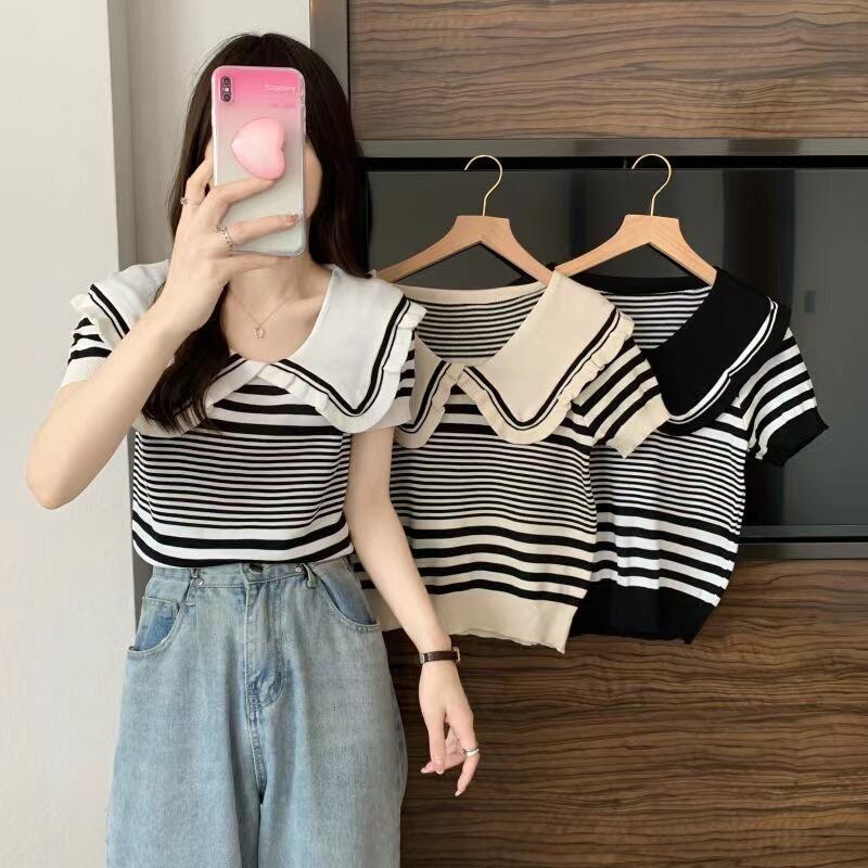 ピーターパンの襟の女性セーターファッションストライプ半袖スリムクロップトップスプルオーバーニットセーター女性服 ショート ハーフスリーブ Aim94355356400