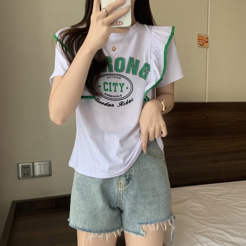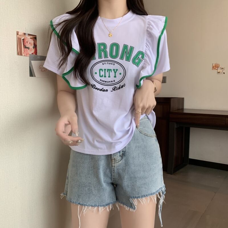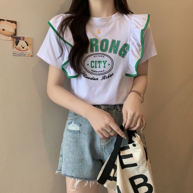 夏の女性の Tシャツグラフィックレタープリント原宿 Streewear 服因果緩いフリルコントラスト Tシャツ Y2K 白トップス ホワイト かわいい サマー 夏物 Aim38823082699