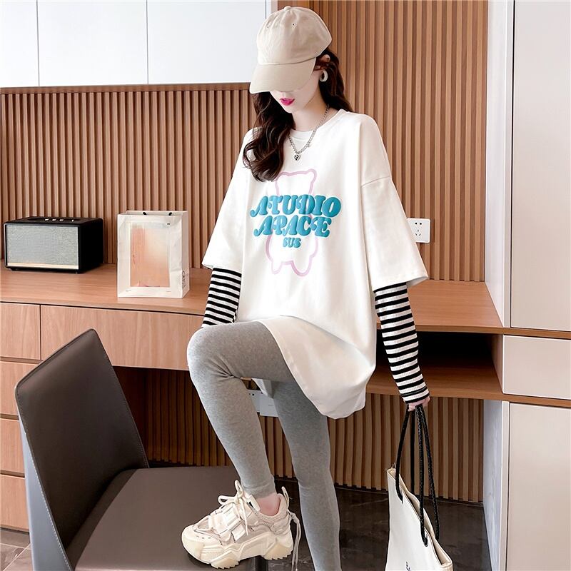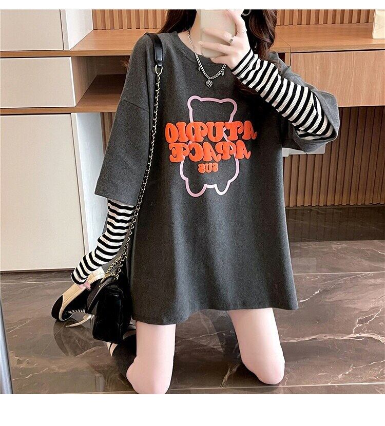 原宿綿長袖大サイズ Tシャツ女性グラフィック Y2k 美的 tシャツトップスストライプパッチワーク偽二枚 Tシャツ ロング コットン 大きめサイズ かわいい Aim84756714028