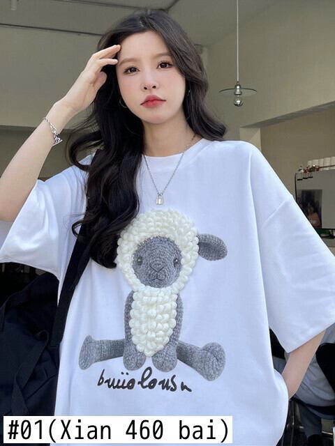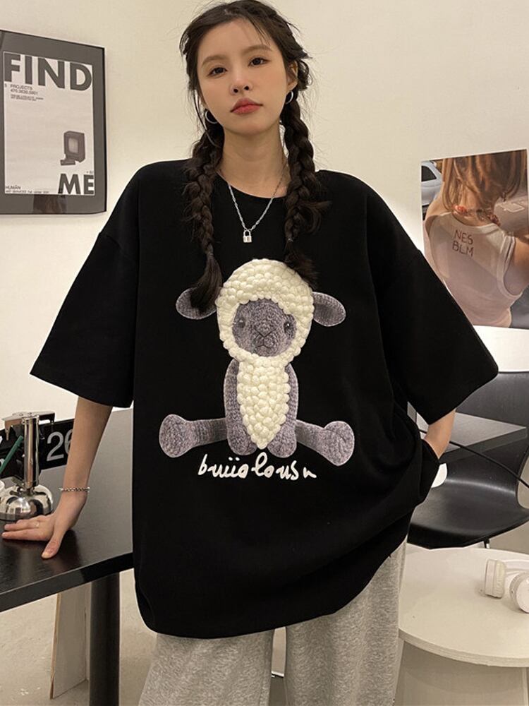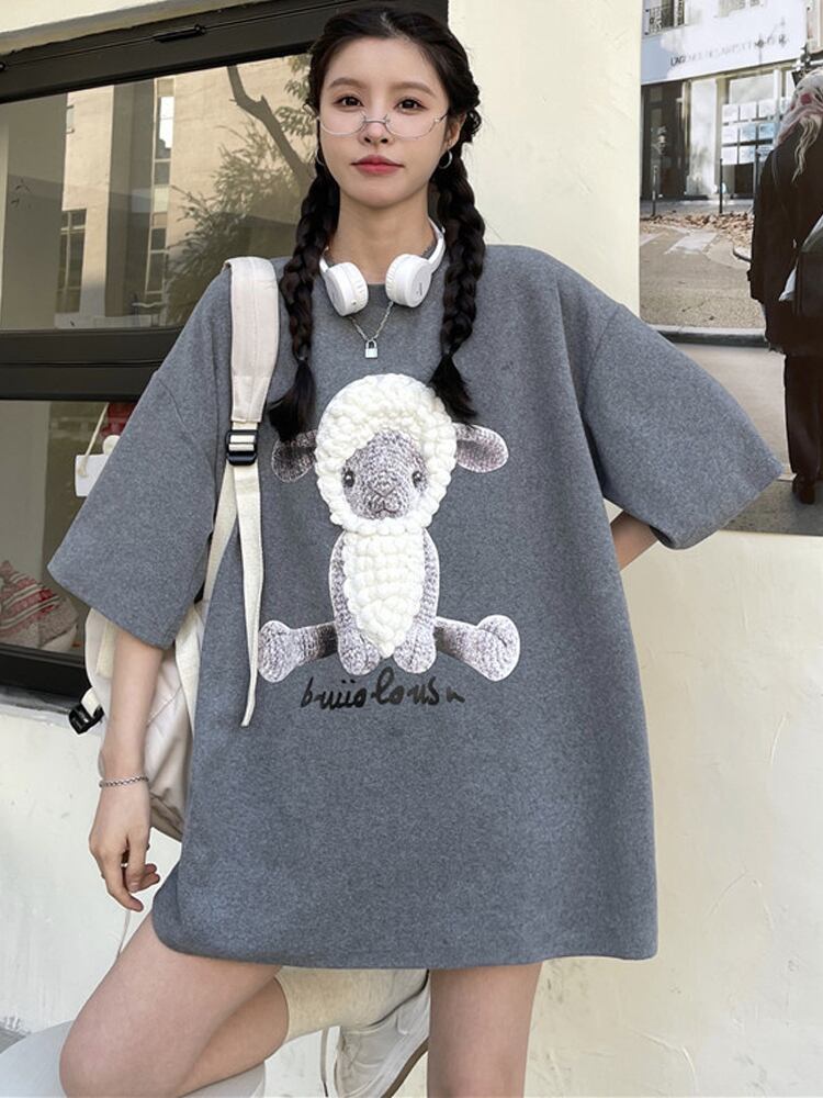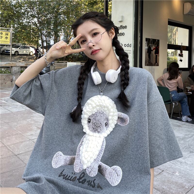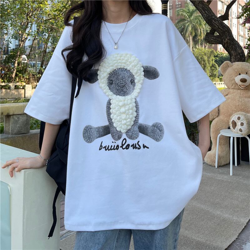 原宿特大純綿 BF ロング tシャツ夏三次元漫画羊ソフト Tシャツ女性女性服 y2k トップス コットン かわいい サマー 夏物 ピュア Aim30779110515