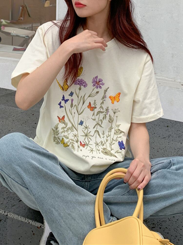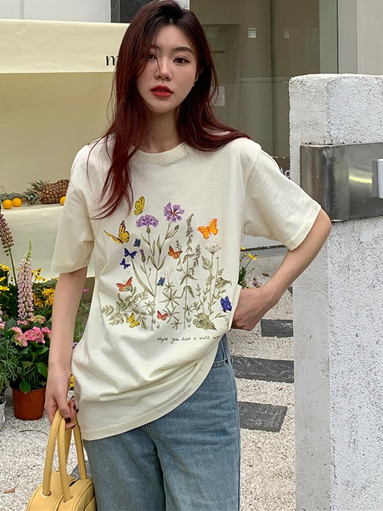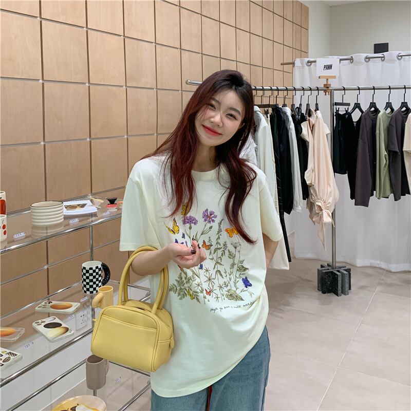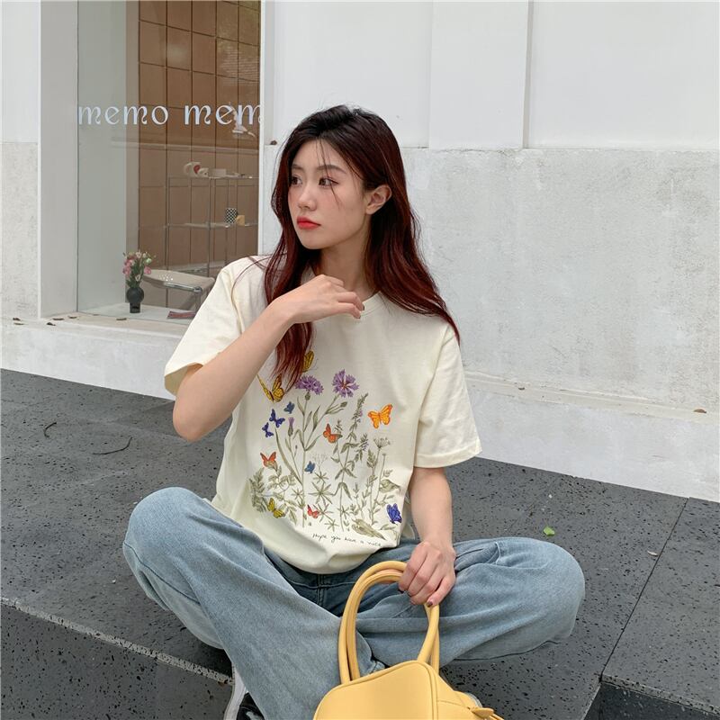 原宿純粋な綿の女性の Tシャツ緩いアプリコット Tシャツ人格フラワープリント半袖 Tシャツ y2k トップス ショート コットン ハーフスリーブ かわいい ピュア フラワーデザイン Aim82943181066