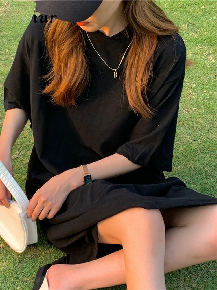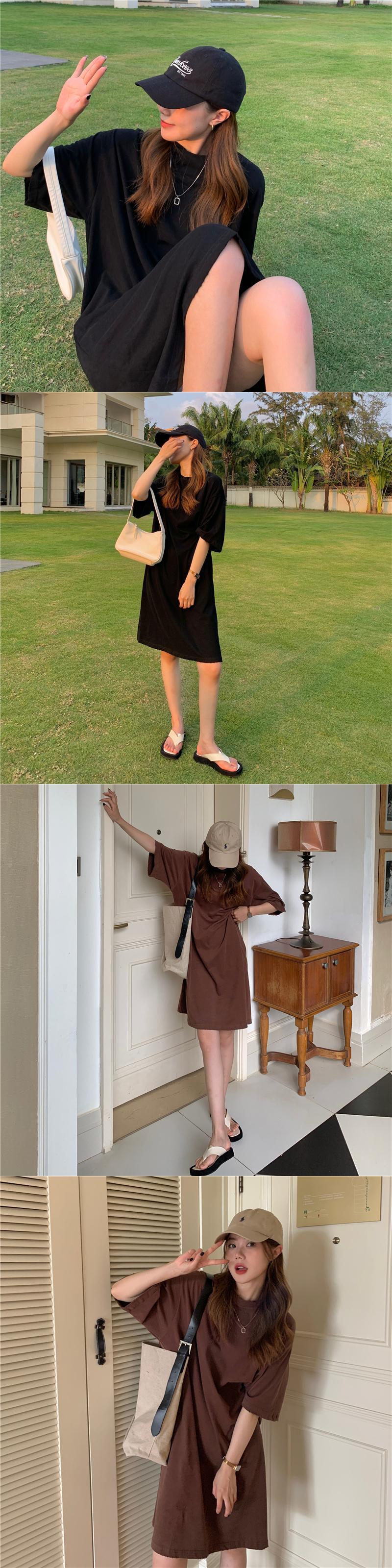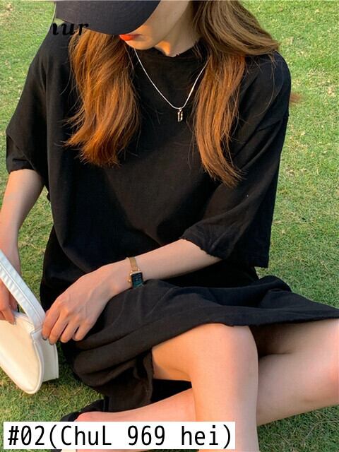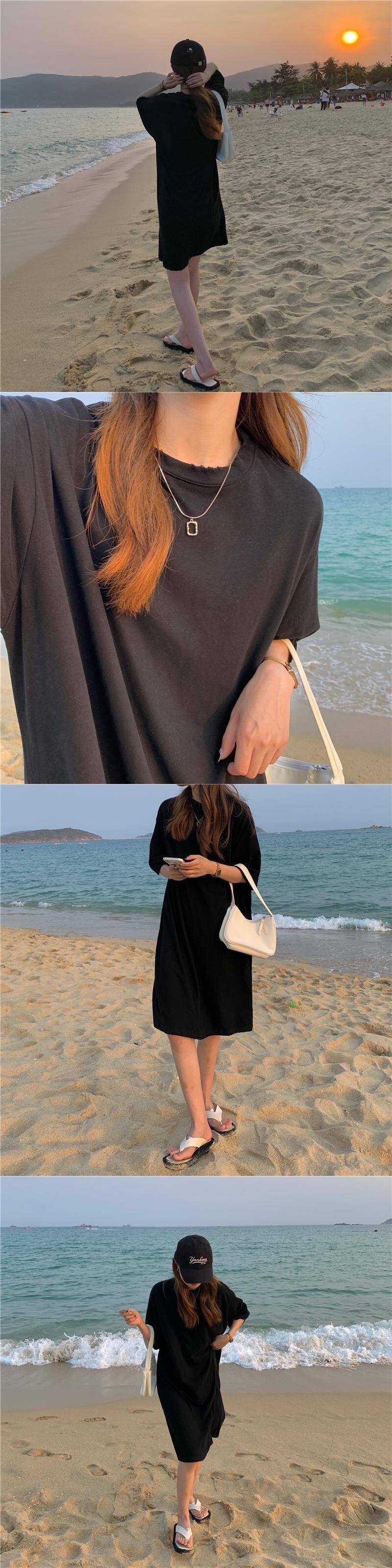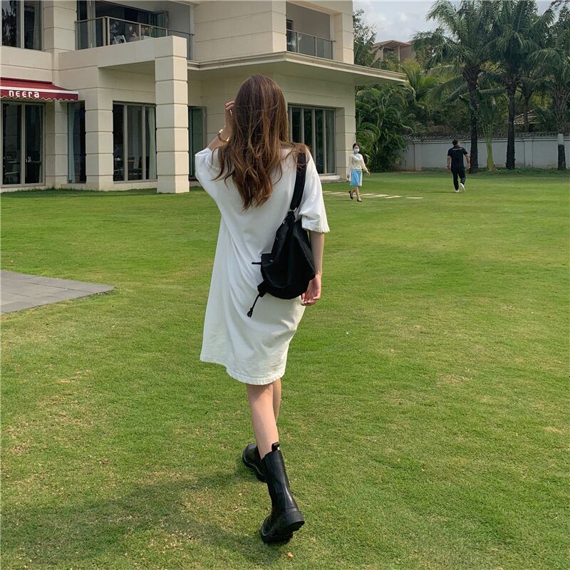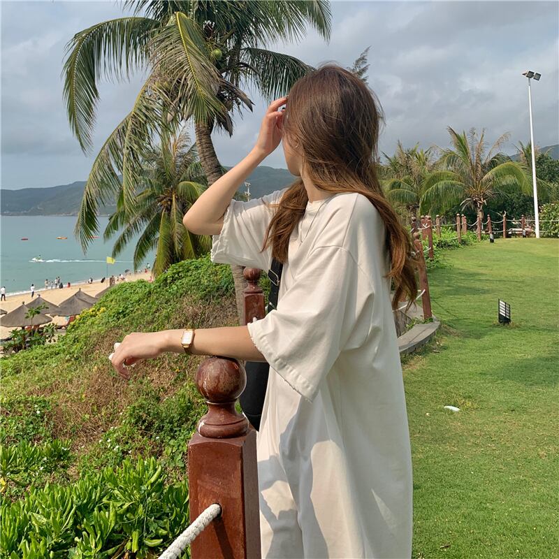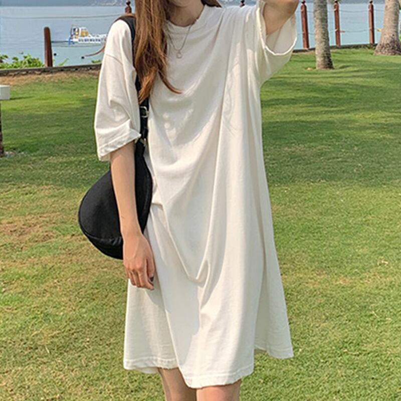 夏半袖ピュアコットンホワイトミニドレス女性シンプルな特大コーヒーブラックドレス無地ロングトップスドレス ショート ハーフスリーブ サマー 夏物 ソリッドカラー Aim66183836067