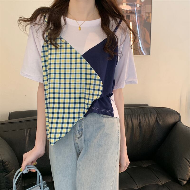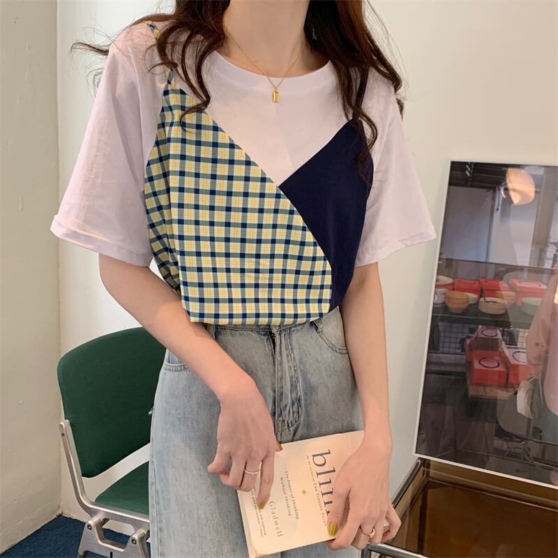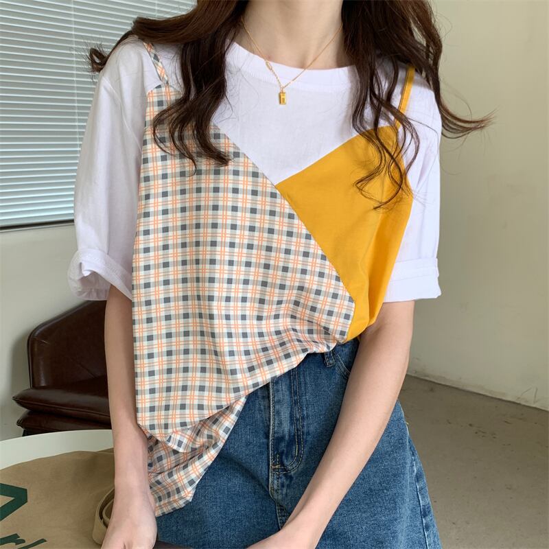 原宿純粋な綿の女性の Tシャツ夏チェック柄パッチワークフェイクツーピース Tシャツカジュアル特大半袖服白トップス ショート ホワイト コットン ハーフスリーブ かわいい サマー 夏物 ピュア Aim42976015149