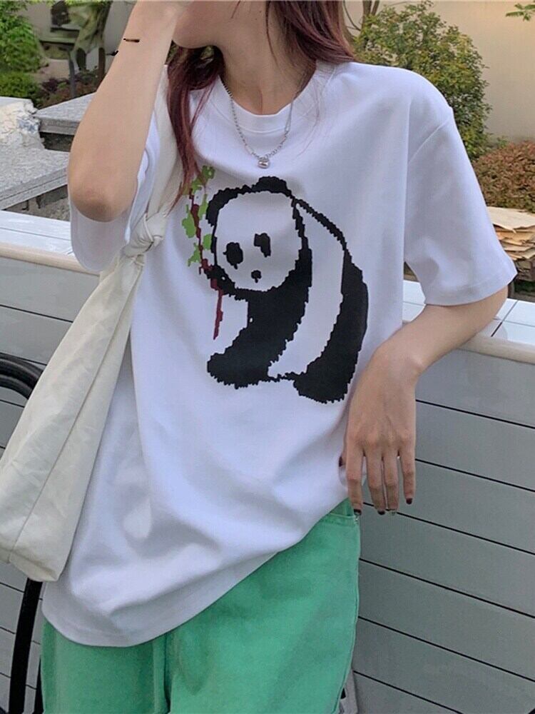 夏のカジュアルな女性の Tシャツルーズ半袖コットン Tシャツスタイルの漫画パンダプリント白トップス服 ショート ホワイト ハーフスリーブ サマー 夏物 Aim40229786835