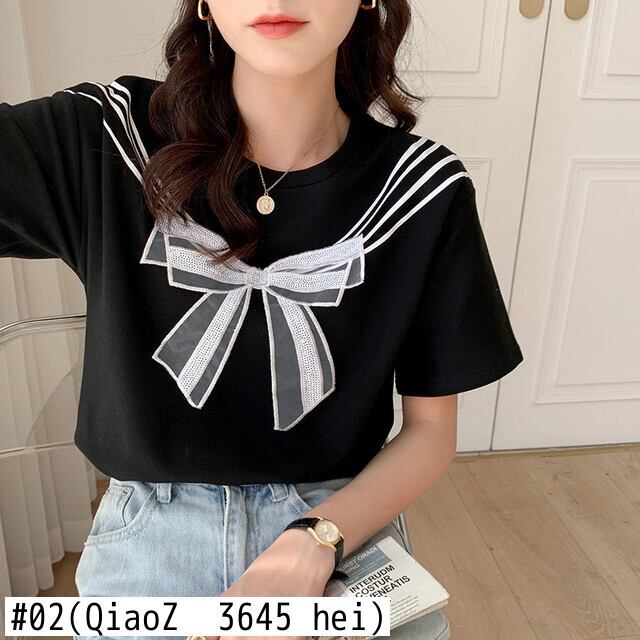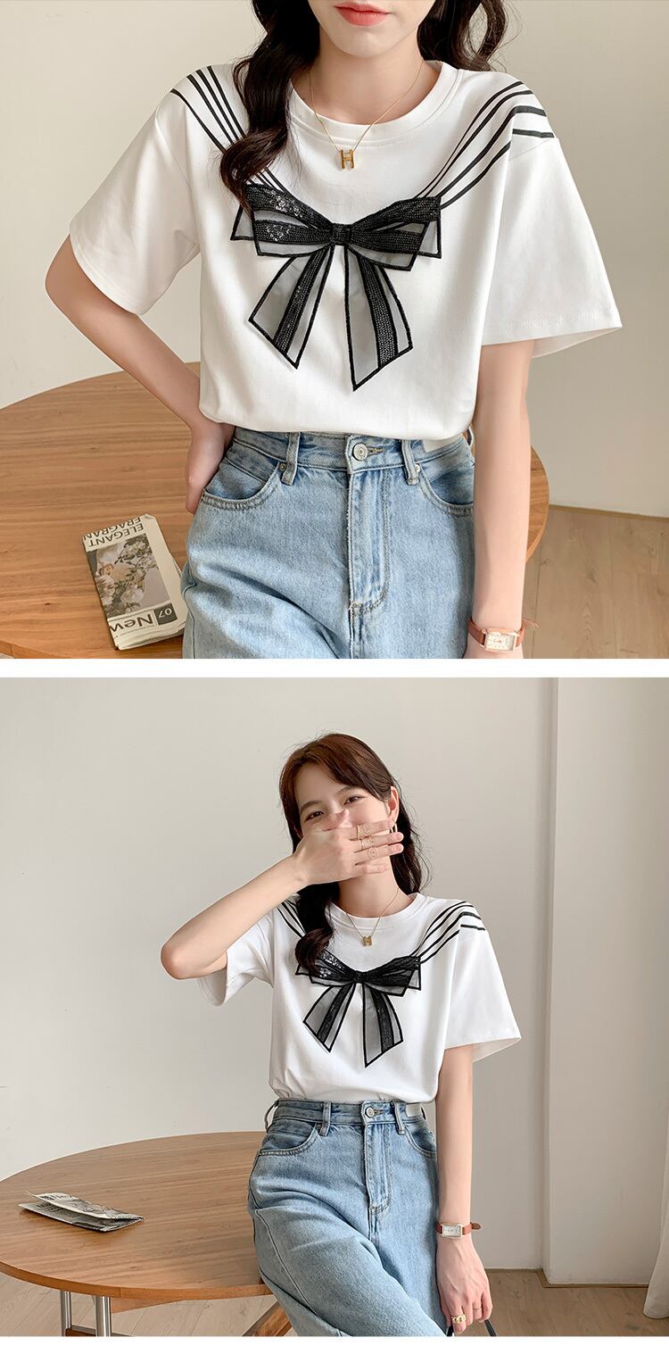 夏の純粋な綿のの tシャツ半袖ルーズ Tシャツ弓メッシュステッチオールマッチ tシャツ白トップス服 ショート ホワイト リボン コットン ハーフスリーブ サマー 夏物 ピュア