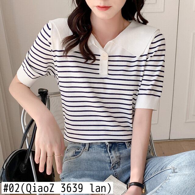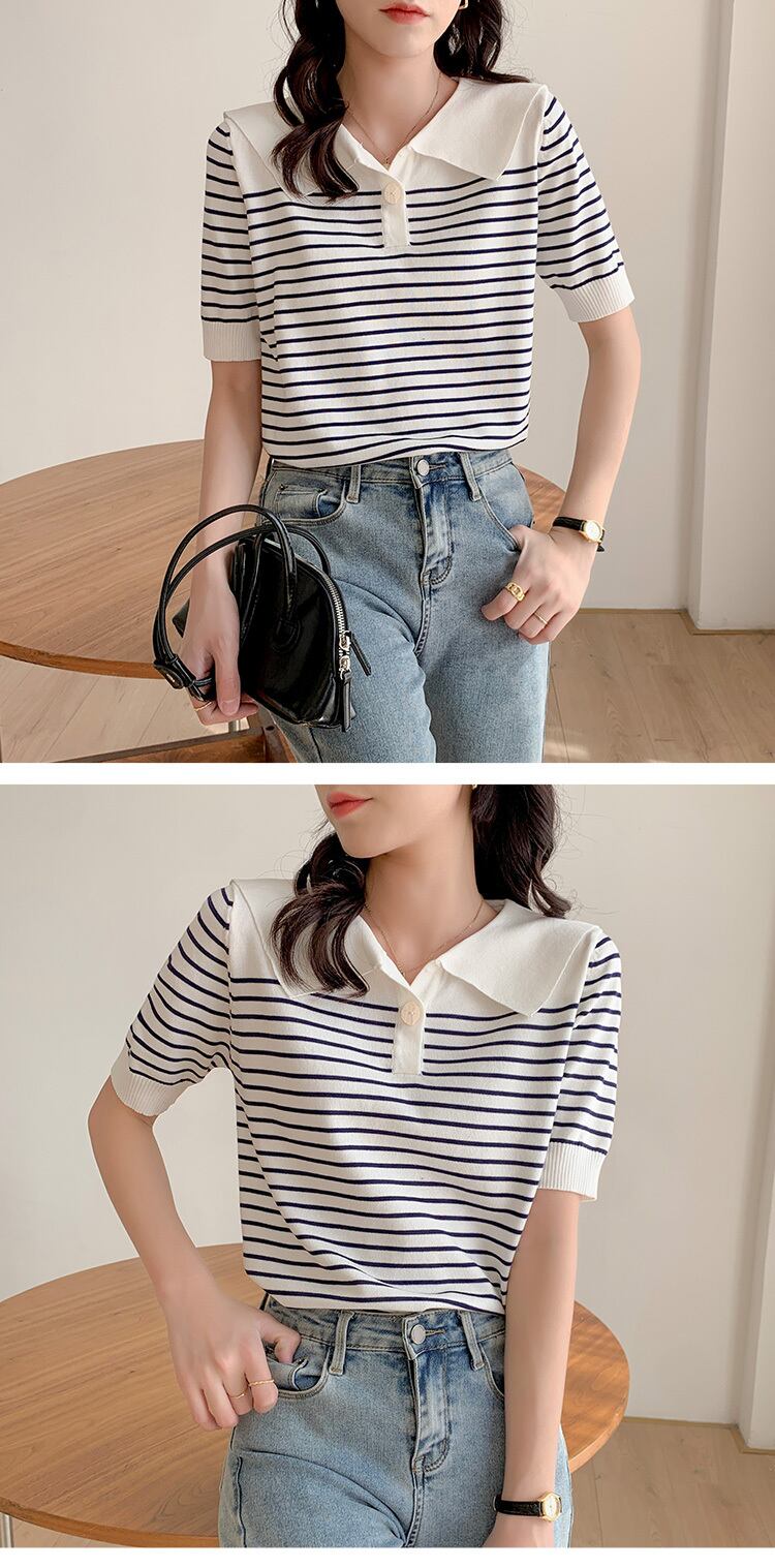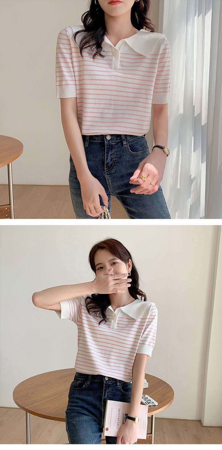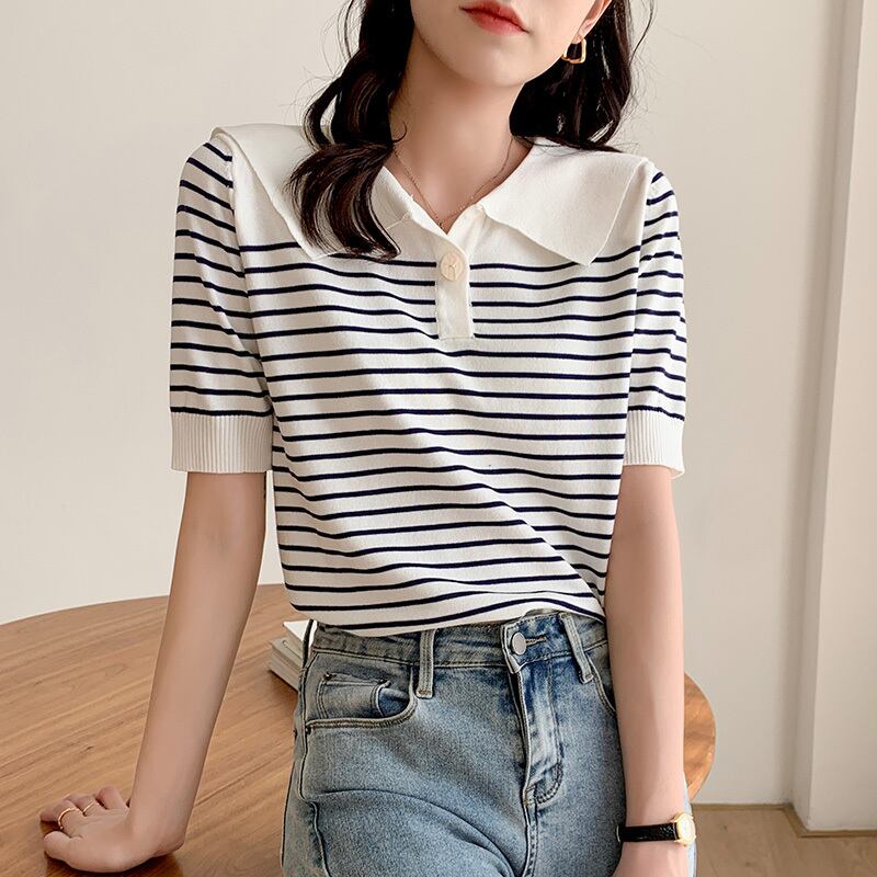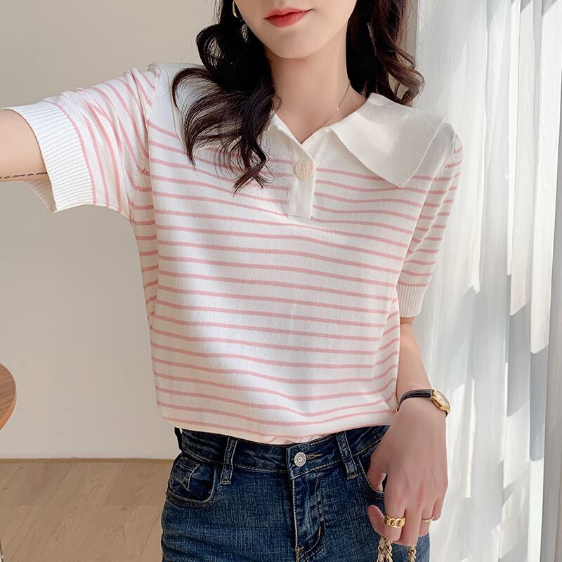 夏ストライプニット Tシャツルーズ半袖パッチワークニットトップス韓国ファッションシンプルなグラフィック Tシャツ ショート ハーフスリーブ サマー 夏物