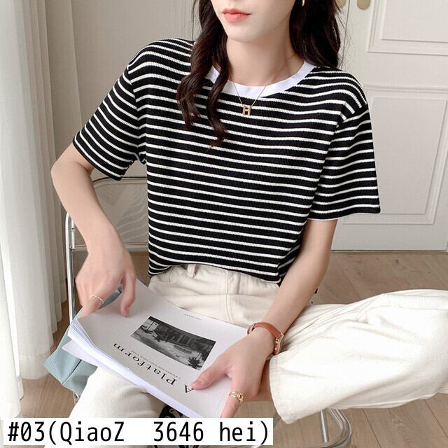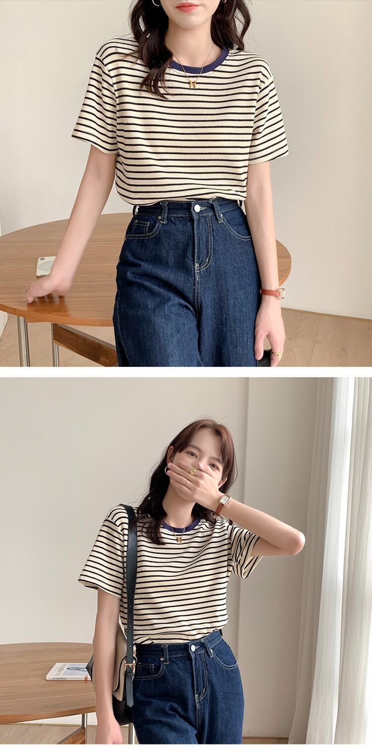 夏の女 ショート コットン 半袖 ハーフスリーブ ストリート かわいい サマー 夏物 Oネック ストライプ Tシャツ ピュア 会社 学校 通勤や通学にも