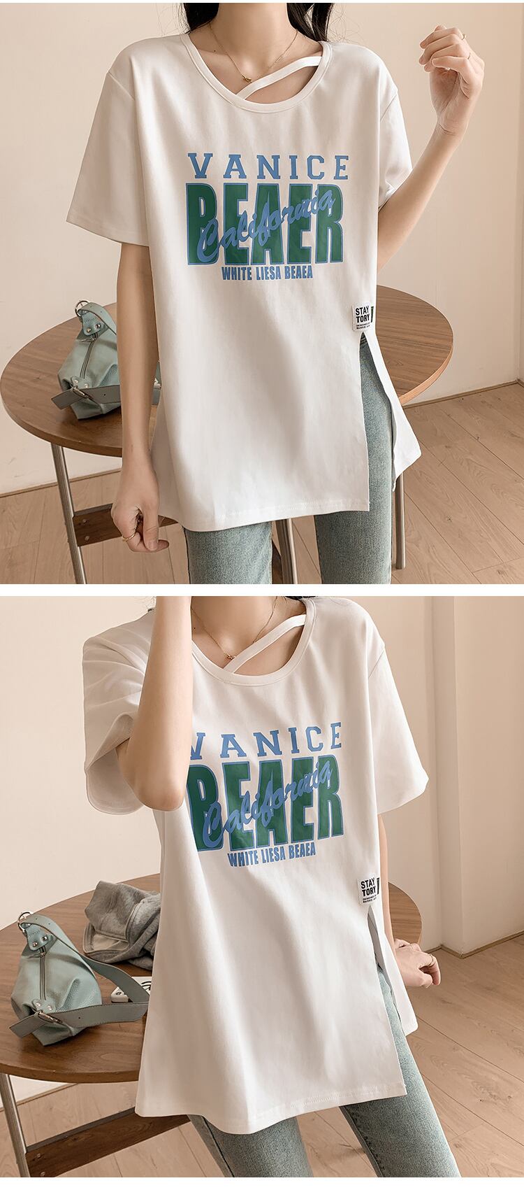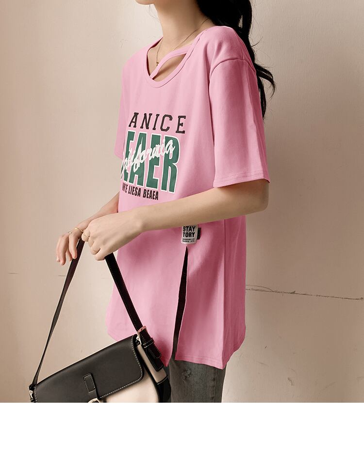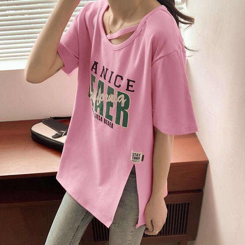 夏純綿ベーシック半袖 Tシャツレタープリントサイドスプリット Tシャツ白特大ストリート y2k トップス ホワイト コットン サマー 夏物 ピュア