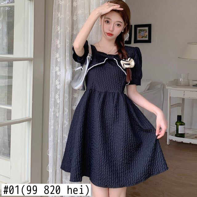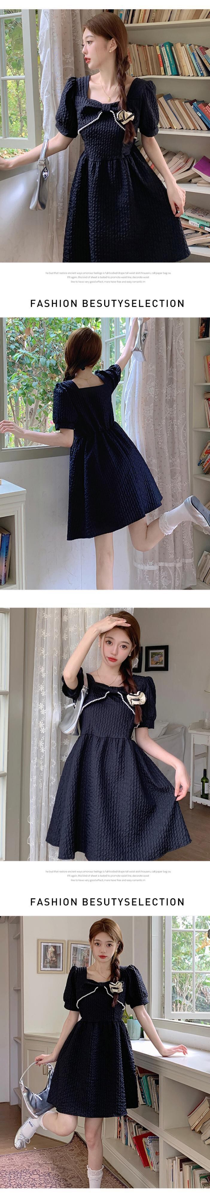 夏のミニドレス V ネック真珠の弓プリーツドレスパフスリーブシックな黒パーティーコルセットボディコンドレス ブラック リボン サマー 夏物 Vネック パール