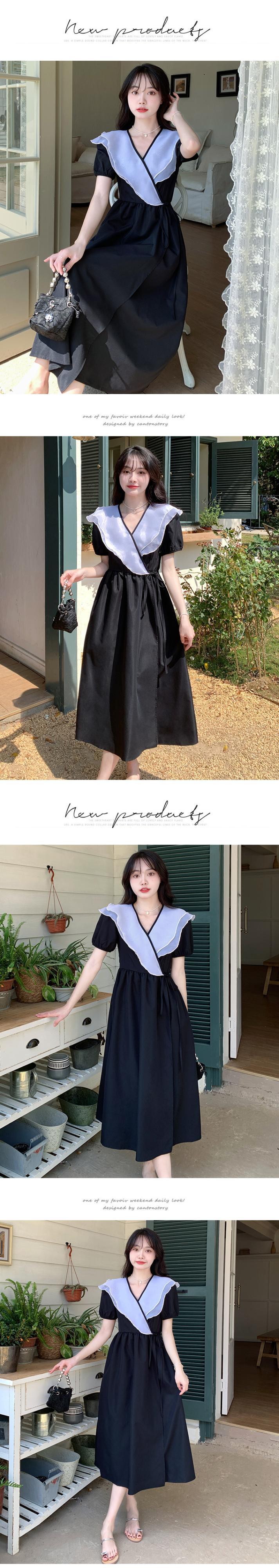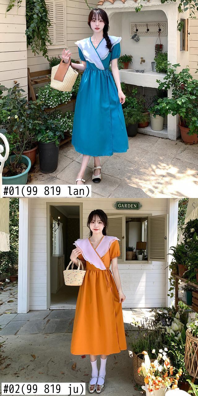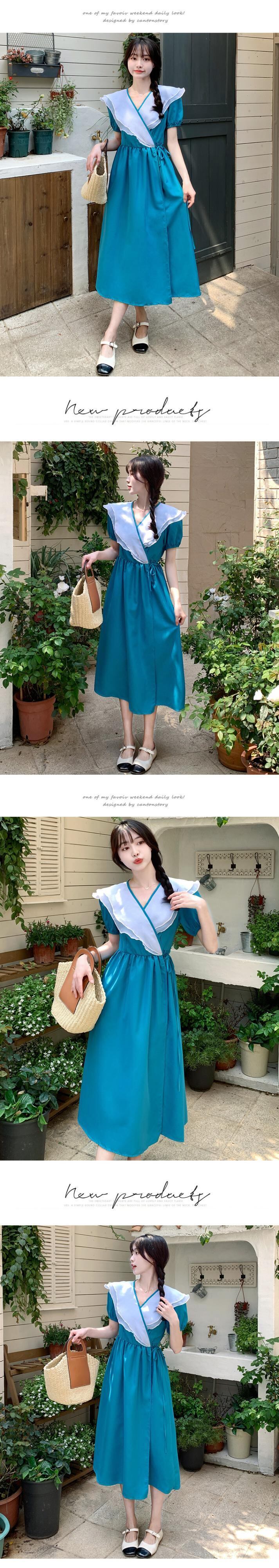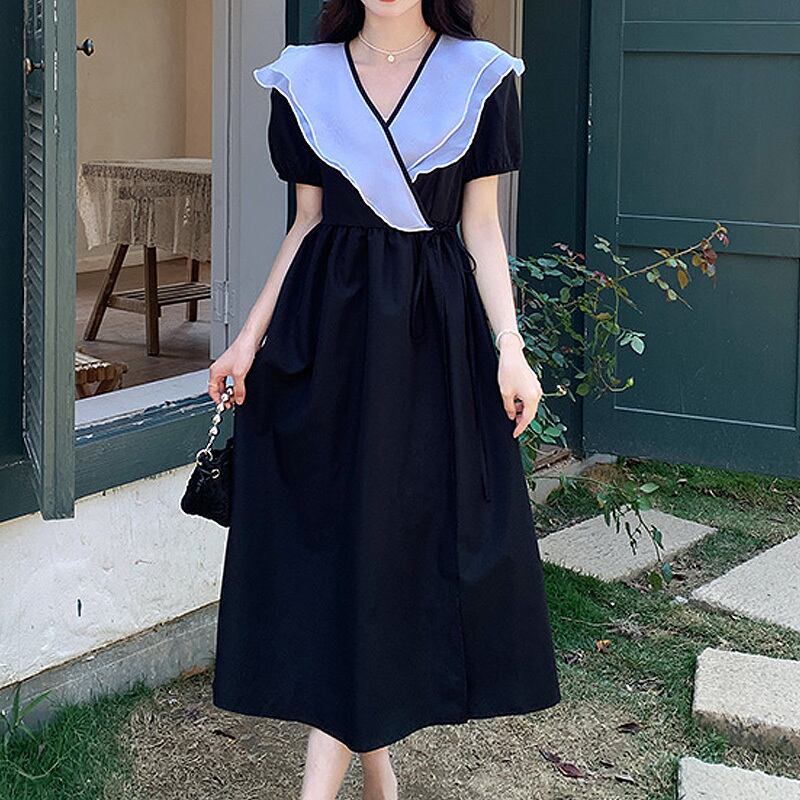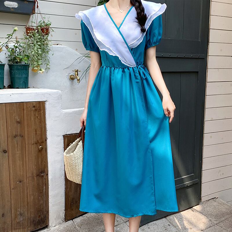 韓国ドレス夏蓮の襟ブレストカラーマッチング y2k マキシドレスワンピースタイプブルー特大ロングドレス サマー 夏物