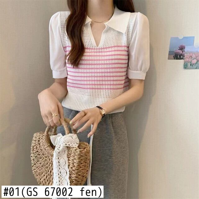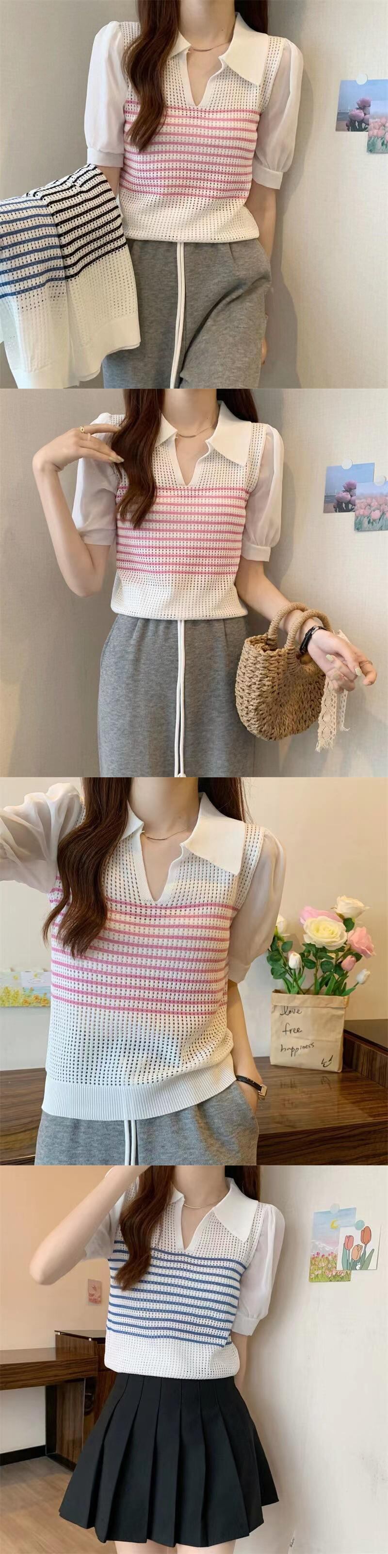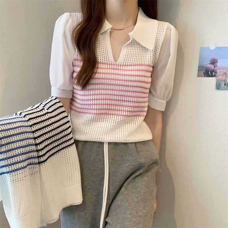 コントラストストライプ中空ニットセーター甘いショート下敷きシャツプルオーバー夏ショートセータークロップトップ 大人ガーリー スウィート キュート カジュアル サマー 夏物