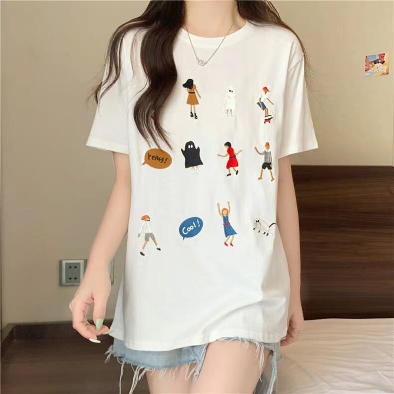 韓国夏漫画グラフィック embroid Tシャツ原宿おかしいゆるい純粋綿 tシャツ服 y2k トップスストリート コットン 刺繍 かわいい サマー 夏物 ピュア
