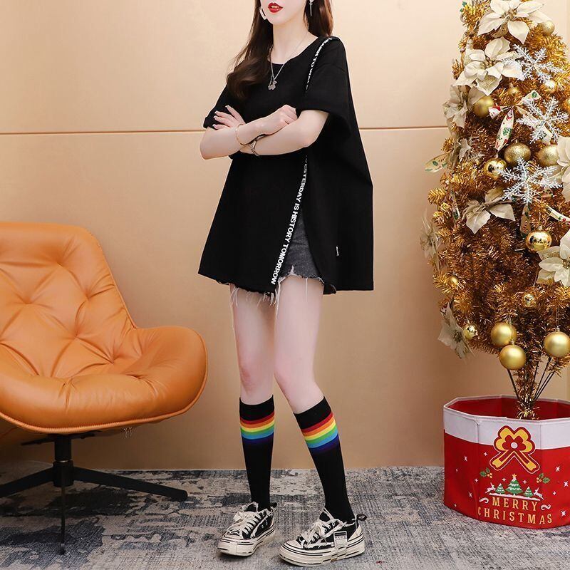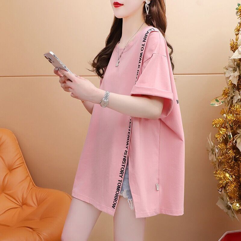 韓国tシャツ夏グラフィックレタープリントtシャツ原宿特大純粋綿サイドスプリットtシャツy2kトップスストリート コットン かわいい サマー 夏物 ピュア