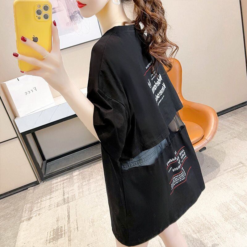 夏カジュアル特大レタープリント中空アウト Tシャツ綿メッシュスプライシング tシャツ y2k トップス原宿ストリート コットン かわいい サマー 夏物