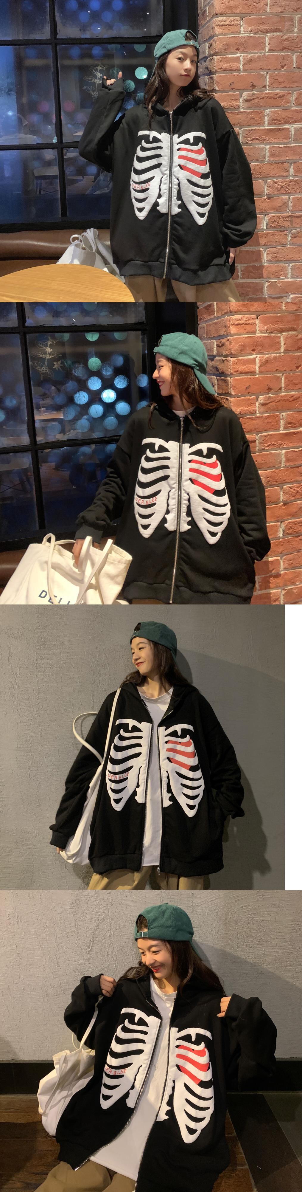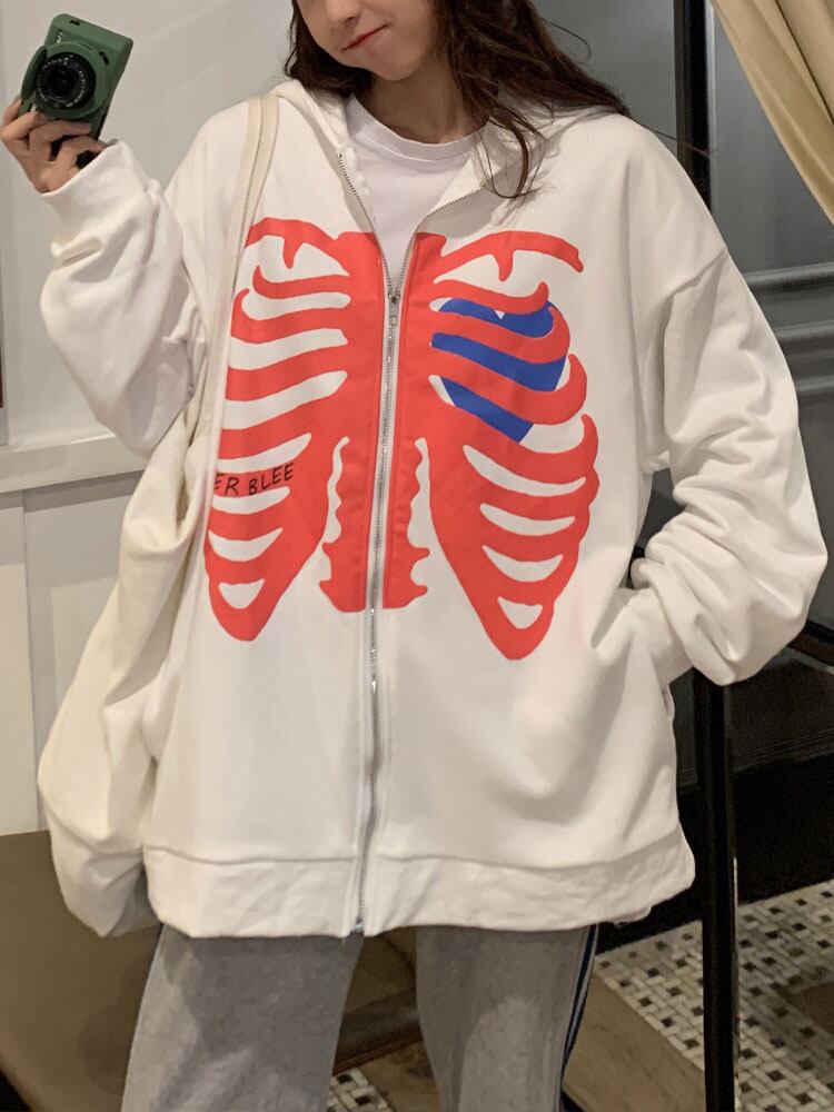 ホット販売スケルトン印刷パーカー男性長袖ジッパーパーカージャケット緩いストリート Y2K コート ロング