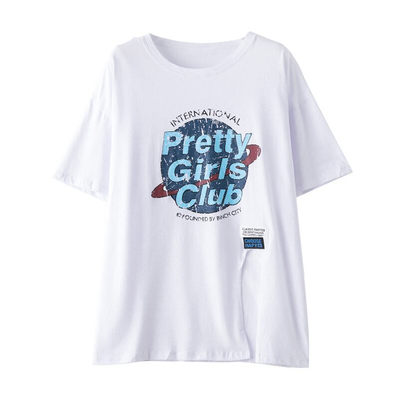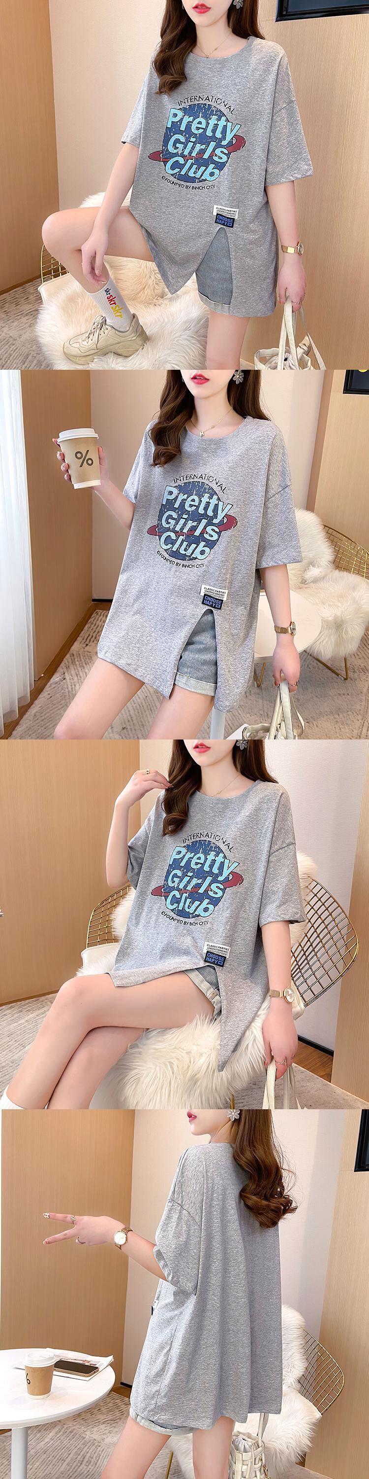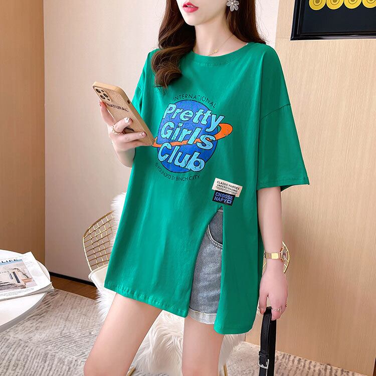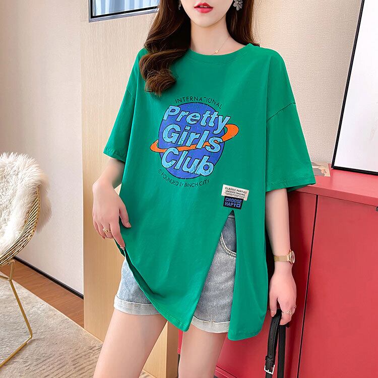 韓国夏グラフィックレタープリント Tシャツ原宿特大綿サイドスプリットロング tシャツ y2k トップストリート コットン かわいい サマー 夏物