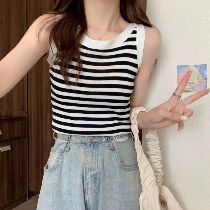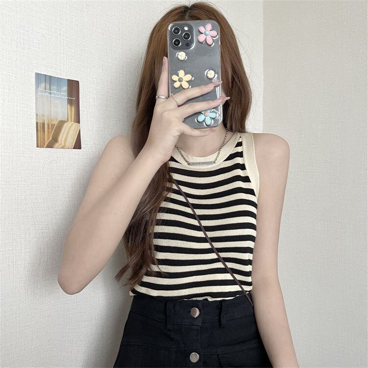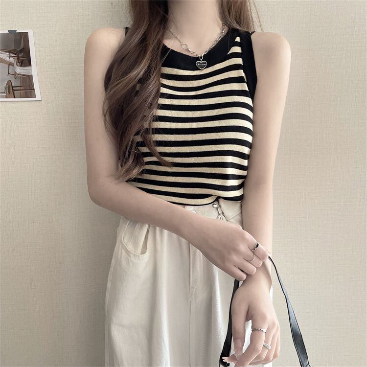 原宿ニットクロップトップ Y2K ヴィンテージストライプノースリーブストラップタンクトップセクシースリムフィットクロップトップス夏服 かわいい サマー 夏物 ビンテージ