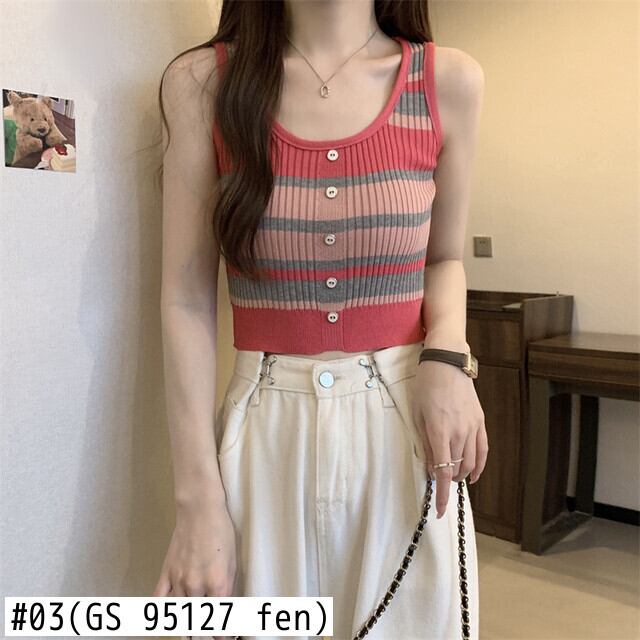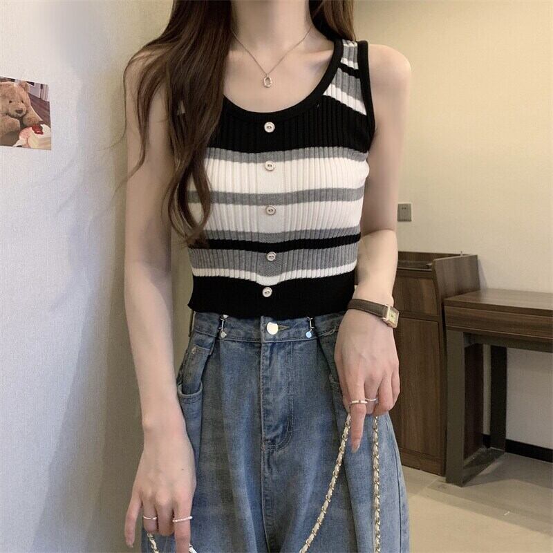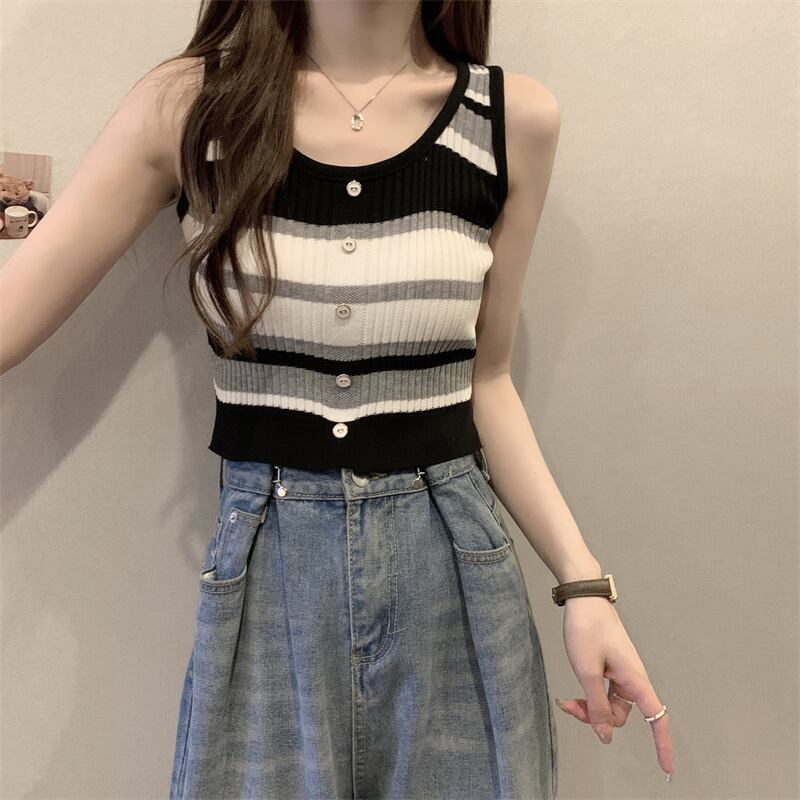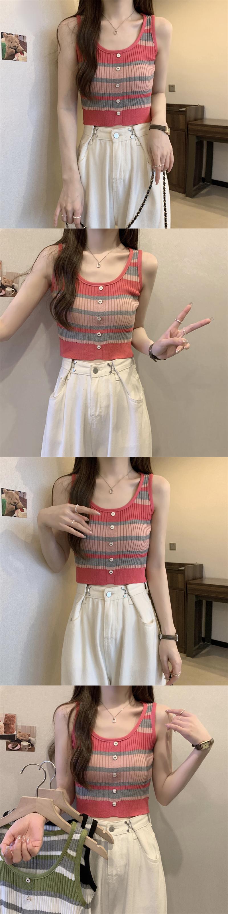 韓国ニットタンクトップホルター夏ノースリーブスリングストライプコントラストスリムフィットショートニットストラップクロップトップ サマー 夏物