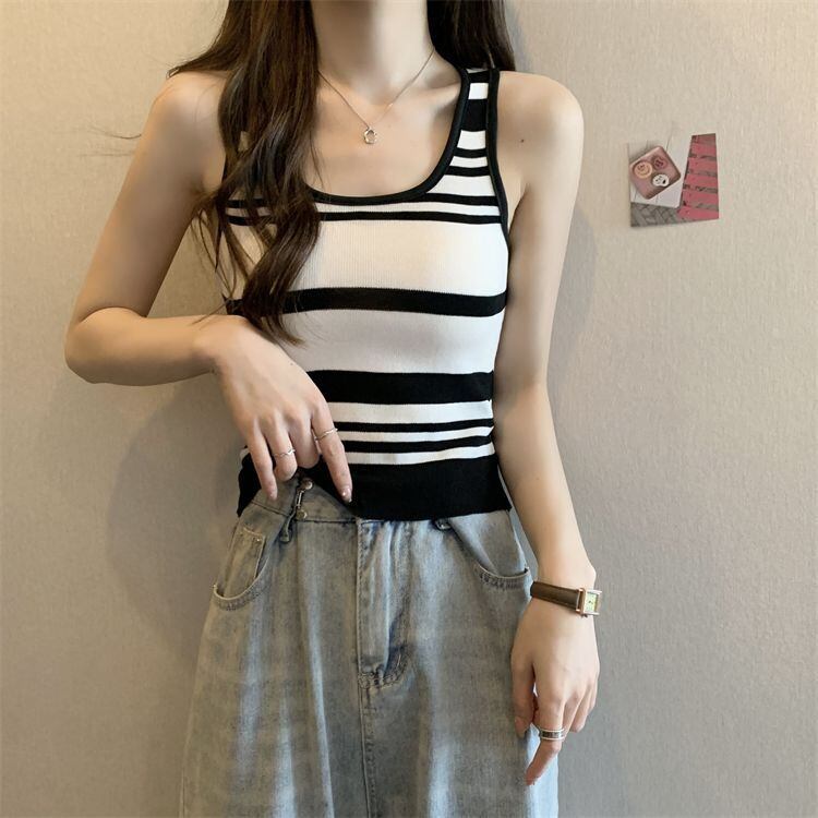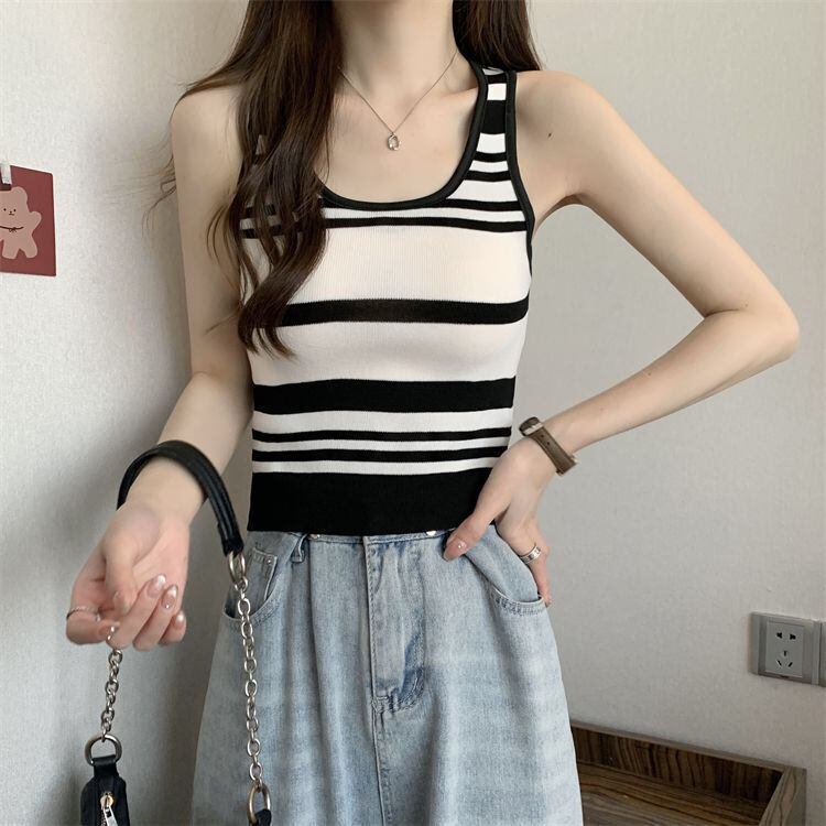 ニット y2k タンクトップホルター夏ノースリーブスリング黒白ストライプコントラストスリムフィットショートニットストラップクロップトップ ブラック サマー 夏物