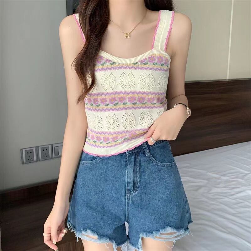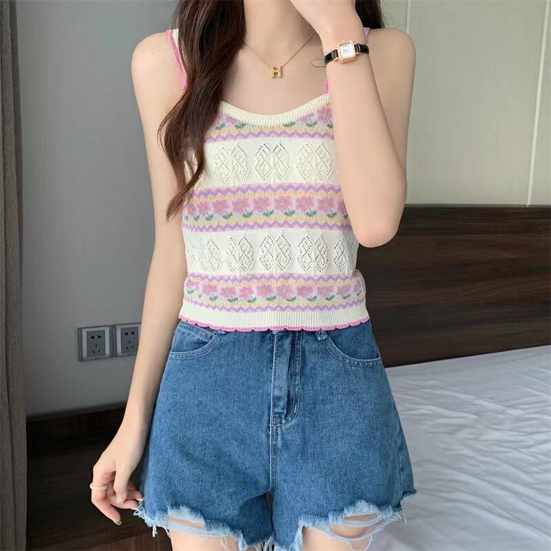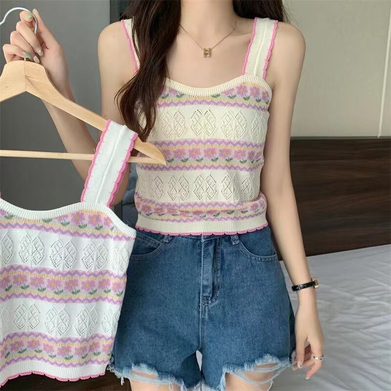 韓国花ニットキャミソールキャミソールオフショルダー中空アウトタンクトップホルター夏ノースリーブ y2k クロップトップス サマー 夏物 フラワーデザイン
