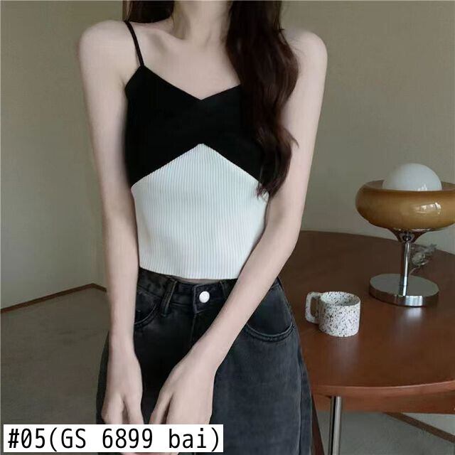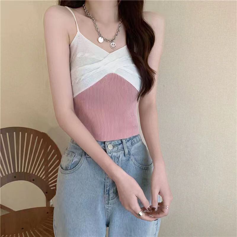 夏スリムコントラストクロップトップスキャミソールニットかわいいタンクトップ原宿ノースリーブ V ネックセクシースリングトップス 大人ガーリー スウィート キュート カジュアル サマー 夏物 Vネック