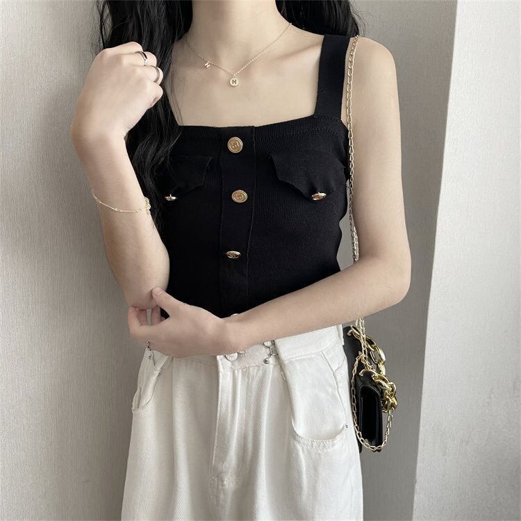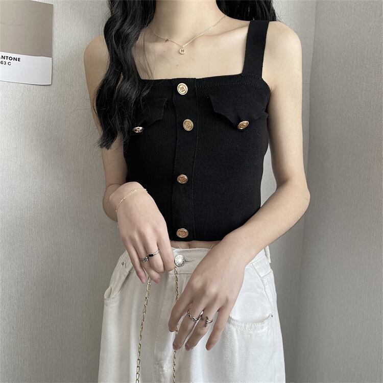 夏スリムフィットクロップトップスボタンキャミソールニットかわいいブルータンクトップノースリーブ O ネックセクシースリングトップス 大人ガーリー スウィート キュート カジュアル サマー 夏物 Oネック ソリッドカラー